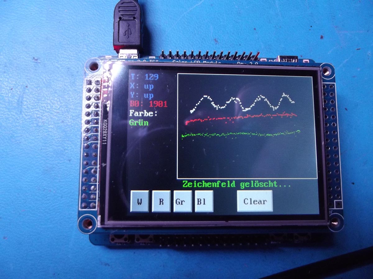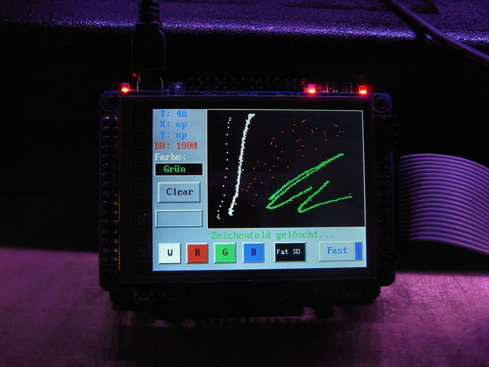 Neben Weiss, können alle 3 additiven Grundfarben als Stiftfarbe benutzt werden. Alle verfügbaren Farben sind in dem Bild benutzt worden. Während mit dem grünen Stift gezeichnet wurde, hab ich die Key1 Taste gedrückt gehalten, wodurch der schnelle feine Modus aktiviert war.