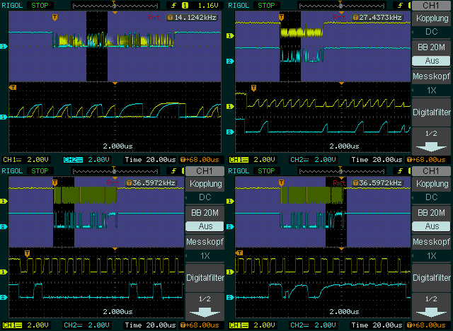 In der aktuellen Einstellung läuft der I2C bei ca. 650 KHz. Höhere Raten sind mit entsprechenden Änderungen möglich... allerdings Soft- und Hardware. Hab ein paar Versuche mit größeren Geschwindigkeiten gemacht, aber es Funktionierte nicht. Später hab ich bei der Funktionierenden Variante mal mit dem Oszi ein Bild gemacht, wobei ich sehen konnte, dass die Übertragung schon recht grenzwertig abläuft.