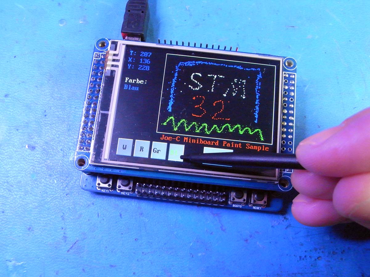 Im Grunde ist es nur eine Mischung aus Touch und LCD Verwendung. Der µC liest die Stiftposition vom Touchscreen und setzt die entsprechenden Pixel auf dem LCD. Mehr ist es im Grunde nicht. Die ausgelesenen Stiftpositionen werden auch in den HID-Array übertragen, so dass bei verbundenem PC auf dem Monitor das schreiben mit verfolgt werden kann (aber nicht in der Performance, wie auf dem Board... das Ganze ist abhängig vom HID-Abfrage-Intervall). Im normalen Modus werden die Stiftpositionen links angezeigt und es werden große Pixel gezeichnet (4 Punkte auf einmal). Im schnellen Modus (wenn Key1 gedrückt gehalten wird) werden nur kleine Pixel (1 Punkt auf einmal) gezeichnet, die Stiftpositionen und die RTC Zähleranzeige werden hingegen nicht aktualisiert... das macht das ganze gekritzel dann relativ flott.