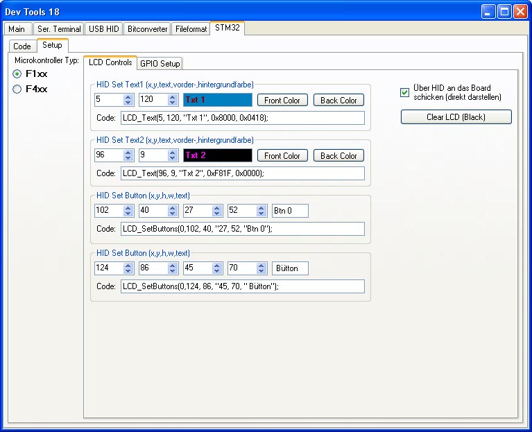 Das Board meldet sich als HID (Human Interface Device) an das System an. Unter Windows wird es als Eingabegerät im Gerätemanager angezeigt und macht erst mal nix weiter. Das Board ist so eingestellt, dass es weder Maus noch Tastatur beeinflusst. Es hat seine eingestellte PID und VID und wartet darauf, dass es angesprochen wird. Das DevTool ist darauf ausgelegt, ein solches HID-Device zu erkennen und anzusteuern. Am PC sind dann 64 Ein und 64 Ausgangsbytes verfügbar. Der Eingangsreport wird alle 64mS abgerufen (kann in _source\USB\usbdesc.c bei bInterval bis auf 1mS reduziert werden... auf Kosten der PC Auslastung). Wenn beide Mini-USBs an einem PC verwendet werden, dann kann man über USB-HID einen Text an das Board senden, welches über die UART den Text wieder an den PC zurück schickt. Oder man steckt die 2 Mini-USBs an 2 verschiedene Rechner und benutzt das Board als Datenbrücke. Dann kann man kleine Textnachrichten hin und her schicken... nicht wirklich sinnvoll, aber schön, dass es geht. Außerdem gibt es zum Testen einen Digitalen Eingang (Key1) und einen Digitalen Ausgang (LED2).