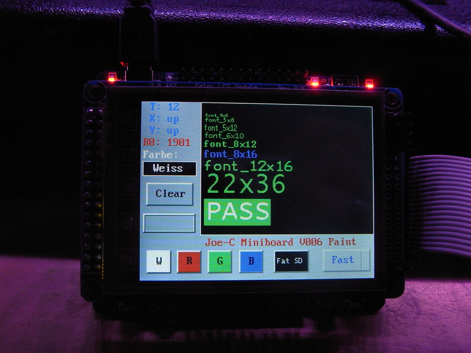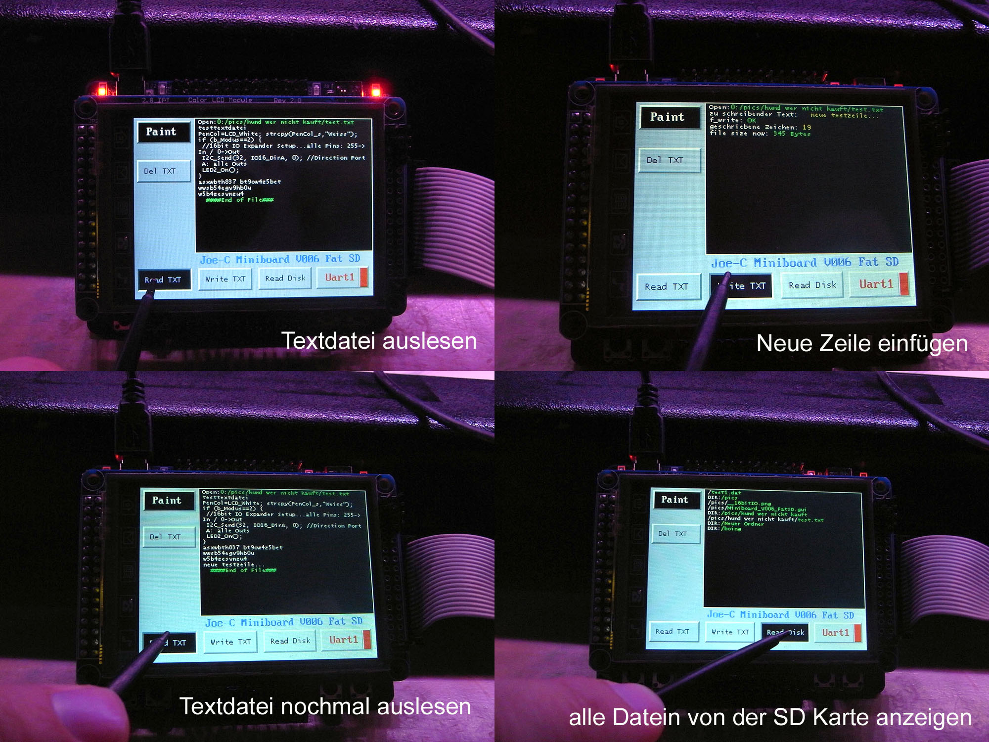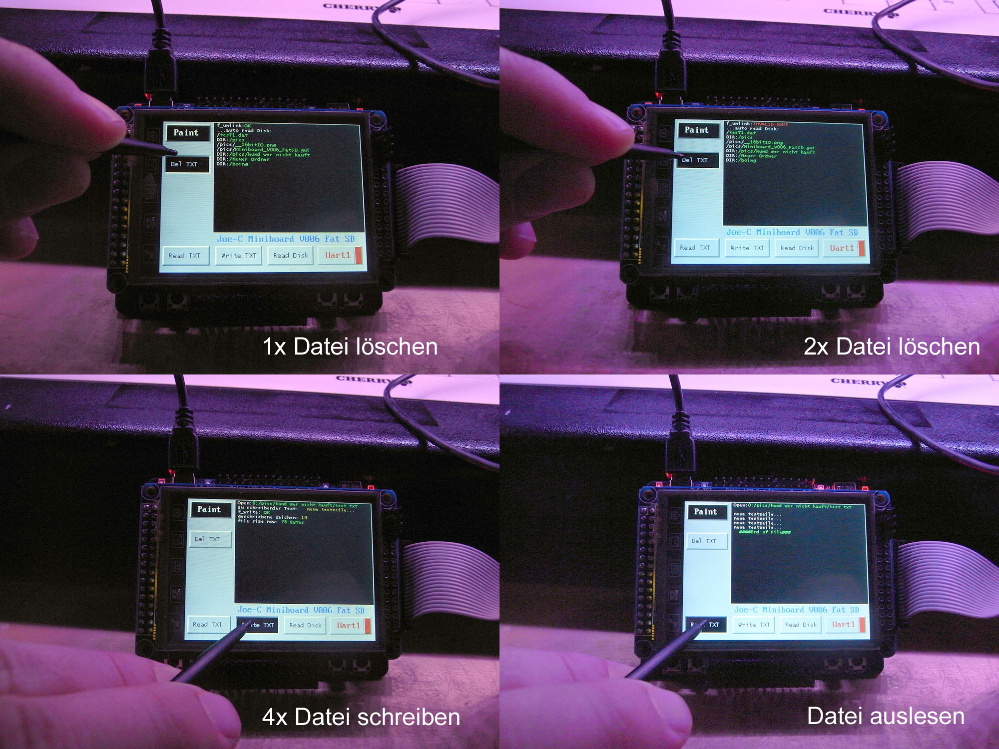 So bald bei V006 auf FatSD geschaltet wird, wird zuerst das Filesystem gemounted. Wenn dann in grün "Init PASS" steht, ist das schon mal ein gutes Zeichen. Fehlende oder falsch Formatierte Karten werden jedenfalls mit einem roten "Init FAIL" angezeigt und dann ist davon auszugehen, dass die 4 Testfunktion auch nicht arbeiten.