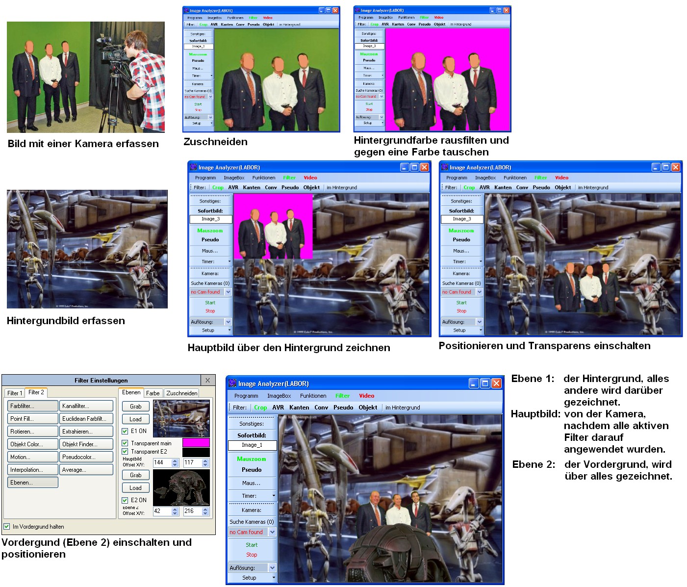 Man packt einen Objekt (oder eine Person) vor eine grüne oder blaue Wand und lässt vom Computer diese Farbe entfernen. Wichtig ist, dass die Hintergrundfarbe nur in Bereichen vorhanden ist, wo später was fehlen soll. Idealerweise ist es eine Farbe, die stark im Kontrast mit dem Objekt ist. Dann nutzt man den Farbfilter, um die Hintergrundfarbe gegen schwarz zu tauschen. Dieses schwarze wird dann weg gelassen, wenn das Bild über den Hintergrund gezeichnet wird. Dann wird ein weiteres Bild über beide gezeichnet, wobei wieder eine definierte Hintergrundfarbe weg gelassen wird. Bei richtigen Farbfilteranwendungen wird man natürlich nicht über schwarz, sondern eine Farbe gehen, die nicht im Bild vorkommt (z.B. Fuchsia oder Magenta). Der AForge Farbfilter generiert schwarz. Ich hab noch einen eigenen Farbfilter (Typ 2) für eine Farbe eingebaut, bei dem die Generierte Hintergrundfarbe eingestellt werden kann. Bei mir ist Fuchsia Standard.