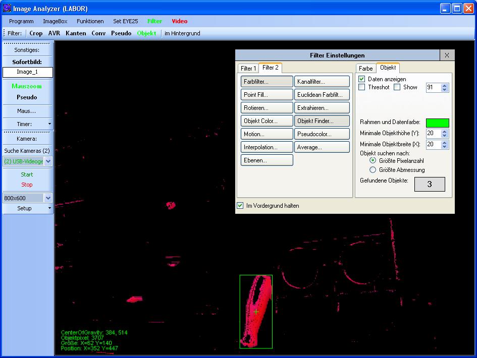 Der Objektfinder setzt alle nicht schwarzen und benachbarten Pixel zu einem Objekt zusammen. Das hat dann eine Höhe, Breite, Pixelanzahl und einen Punkt, um den sich die meisten Pixel des Objekts befinden (Center of Gravity). Objekte die zu klein sind (in diesem Fall 20 Pixel Breite und Höhe), lassen sich raus filtern. Mit Threshold lassen sich Pixel mit geringerer Intensität ebenso raus filtern.