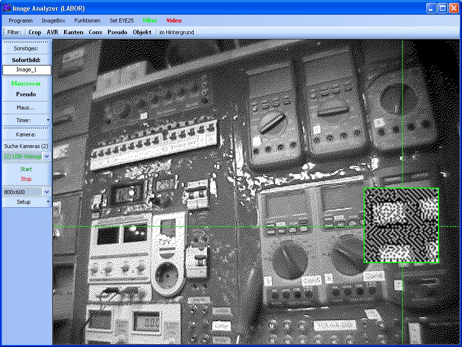 Was hier per Software gemacht wird, lässt sich bestimmt besser mit Hardware erreichen. Wie im Artikel Kamerasensor beschrieben, sendet ein Digitaler Kamerachip seine Bilddaten als Datensatz. Wenn man nun die Daten nicht direkt an das Display sendet, sondern stattdessen eine einfache Abfrage verwendet:
