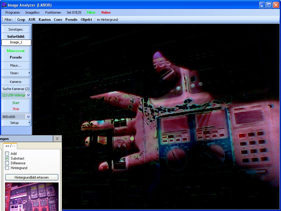 Ein ebenso recht einfacher Filter. Der Subtrahier-Filter macht nix weiter, als jeden Pixel von der Kamera, von einem an der gleichen Position befindlichen Pixel eines Referenzbildes zu subtrahieren. Wenn man also wie im Beispiel unten das aktuelle Bild als Referenz nimmt und dann das Kamerabild davon subtrahiert, dann erhält man ein schwarzes Bild.
