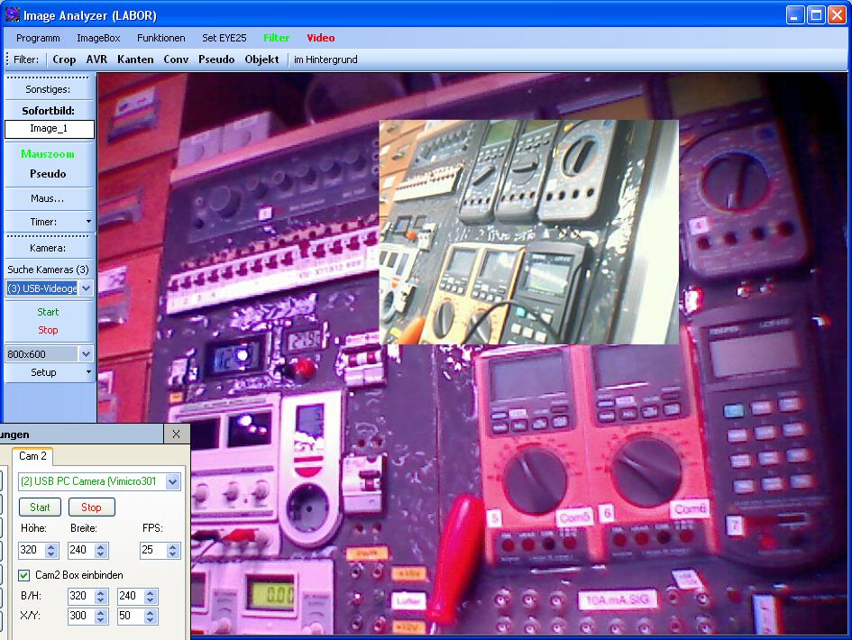 Die Dual Webcam, wurden ja ebenfalls schon in meinen ersten C# Versuchen verwendet. Hier wird allerdings das Kamerabild direkt ins Hauptbild integriert. Recht nützlich, wenn man eine Wärmebildkamera mit Videoausgang hat. Dann kann man sich das Graustufenbild in Farbe umwandeln lassen und an einer Position das Visuelle Hintergrundbild mit dem Wärmebild überblenden lassen.