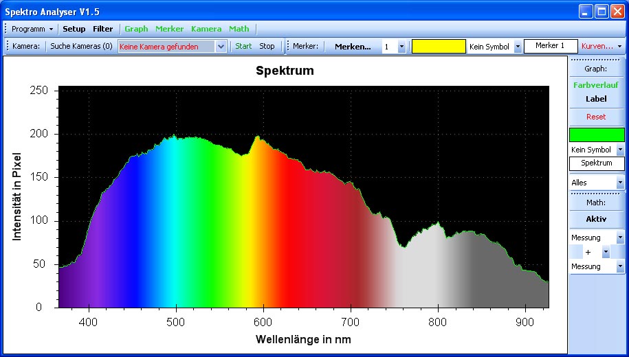 Hier wurden 3 verschiedene Quellen geladen und deren Messwerte über die "Merker" Funktion festgehalten. Die rote Linie zeigt das normale Spektrum einer Webcam (mit IR Filter), die grüne den normalen Spektralbereich vom Tageslicht und die gelbe ein Spektrum mit 850nm Filter.