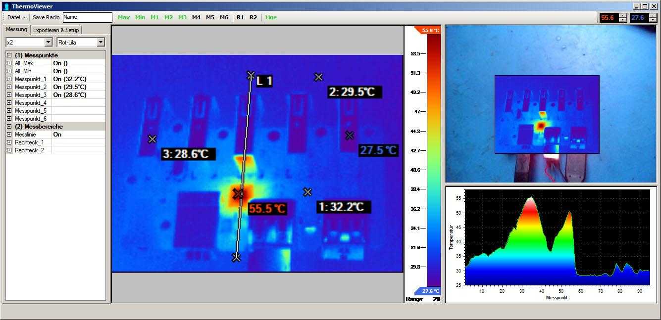 - 2 frei platzier und skalierbare Rechtecke (innerhalb der Rechtecke wird der kleinste und größte Wert angezeigt sowie die Menge der Messpunkte und der Temperaturmittelwert über den gesamten Bereich)