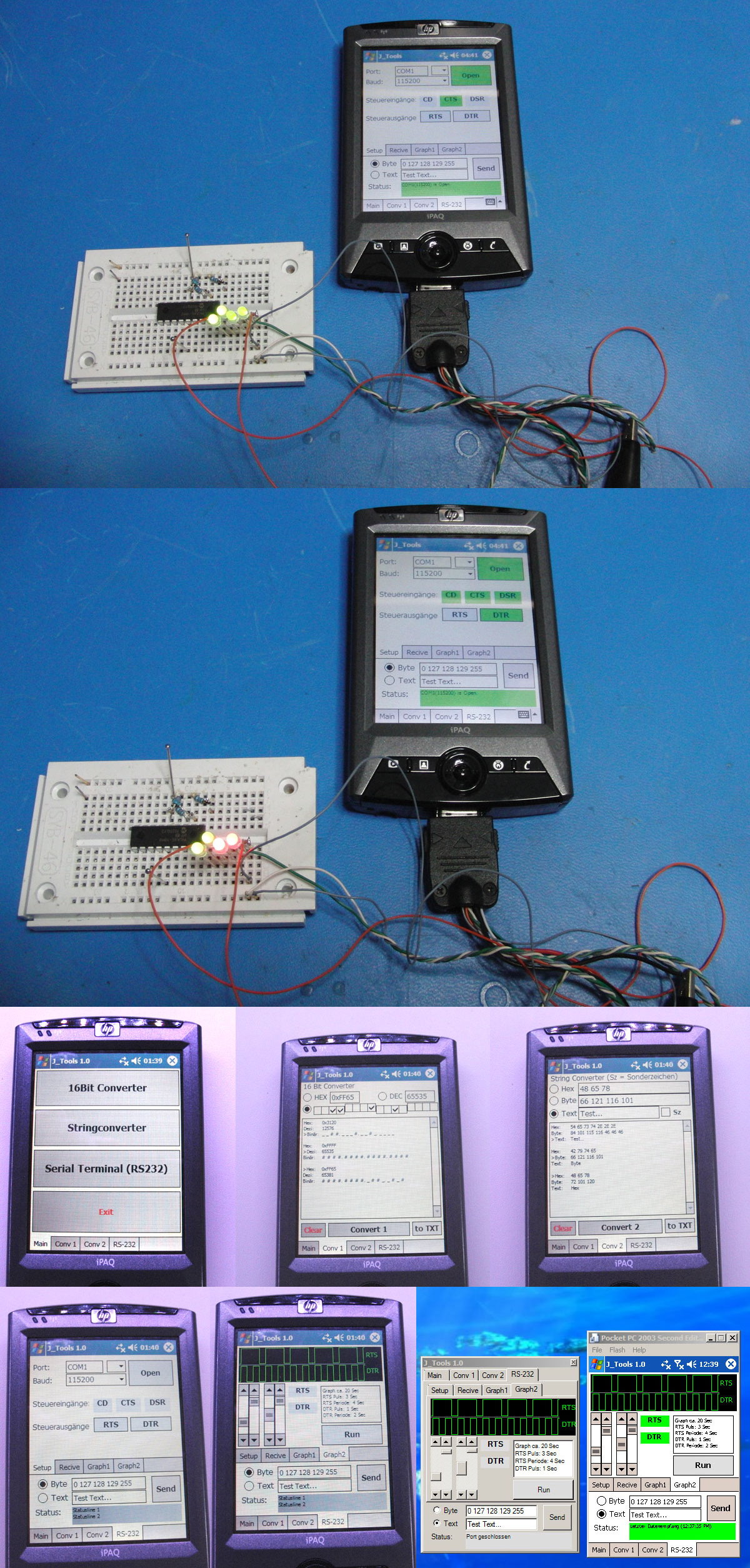 Hier ein Testaufbau für die Steuerleitungen. Obwohl die serielle Schnittstelle 2 Ausgänge und 3 Eingänge hat (Rx und Tx nicht mitgezählt), sind beim Ipaq nur die 2 Ausgänge und 1 Eingang verwendbar. CD und DSR sind gebrückt und CTS ist permanent High. Ein Ausgang hat ca. -5.4V wenn er auf Low ist und +6V bei High. Zum Testen hab ich einfach 2 Duo-LEDs (eine rote und eine grüne LED, antiparallel in einem Gehäuse mit 2 Pins) in Reihe geschaltet.
