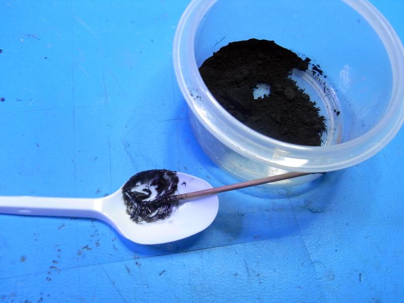Unter Verwendung von Eisenoxidpulver (Eisenoxidpigment Schwarz), kann der Kleber schwarz gefärbt werden, wenn sich das besser optisch mit irgendwelchen Plastikgehäusen verträgt.