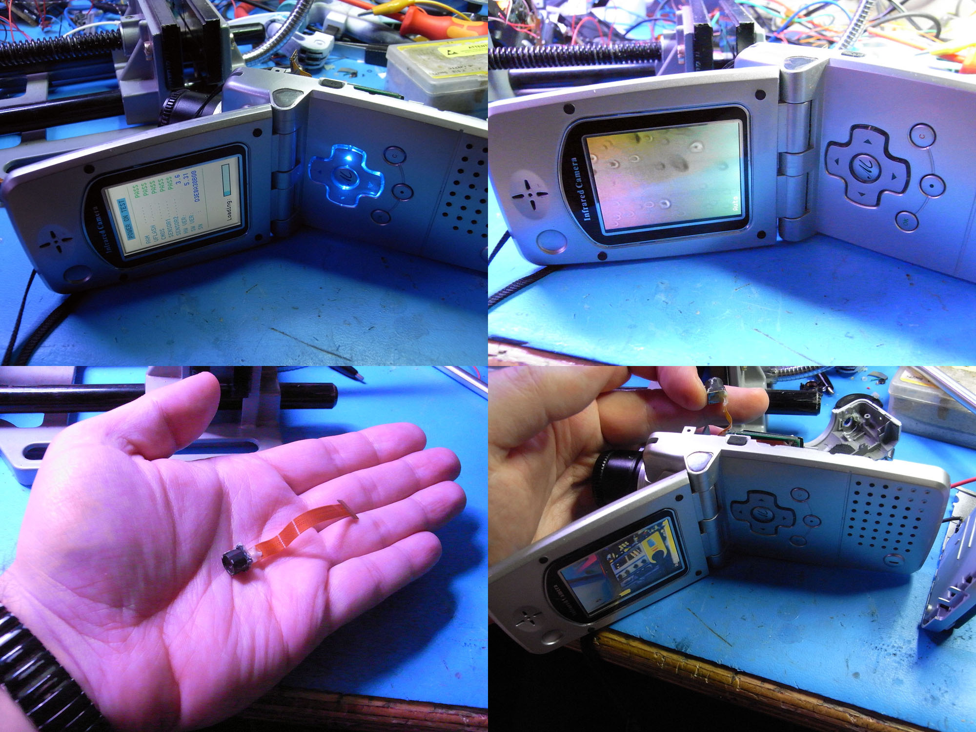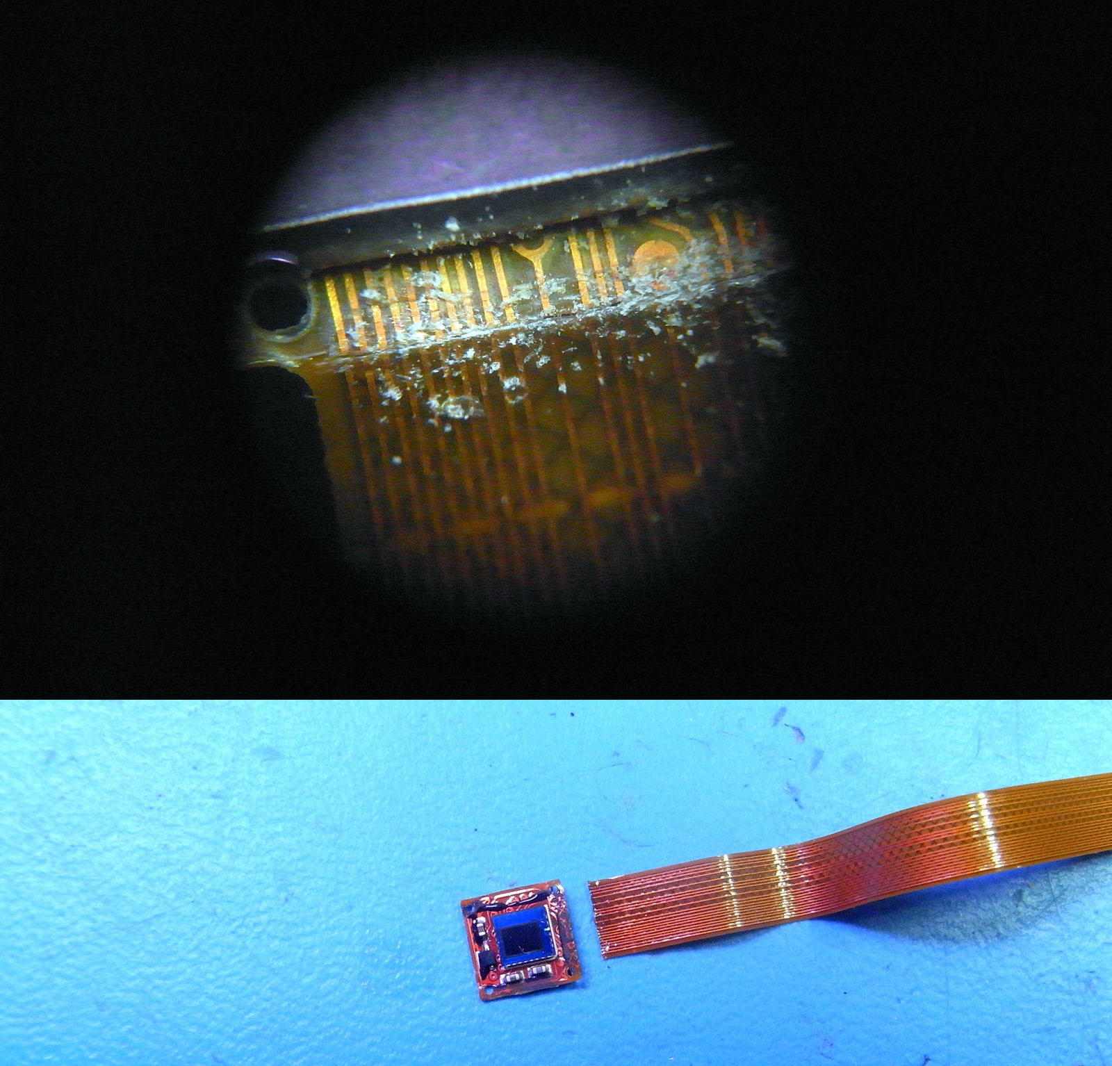 Oben rechts: Auf visuelle Kamera umgeschaltet... Volltreffer. Der Schmutz auf dem Kamerachip wird zwischendurch beim Handling mal drauf gekommen sein, aber ein paar Bewegungen mit der Handfläche (zwischen Chip und Laborbeleuchtung) zeigte, das die Kamera zu funktionieren scheint.
