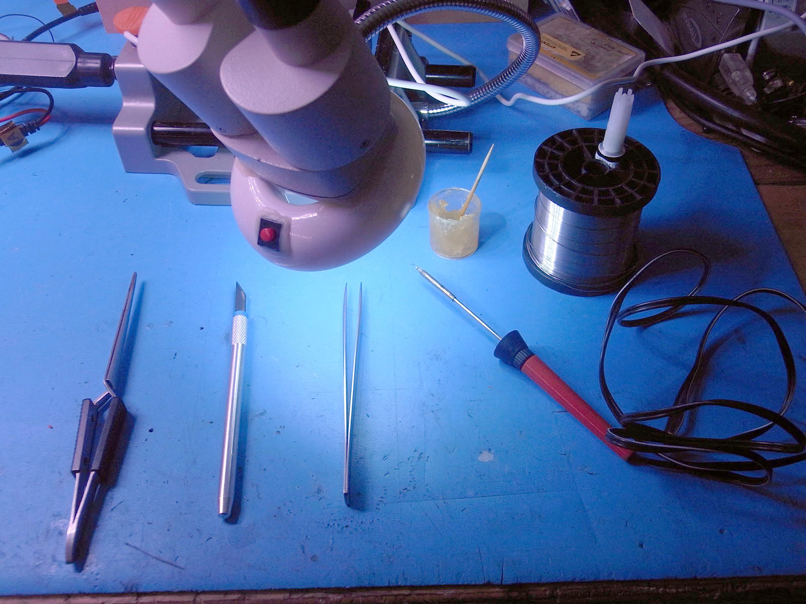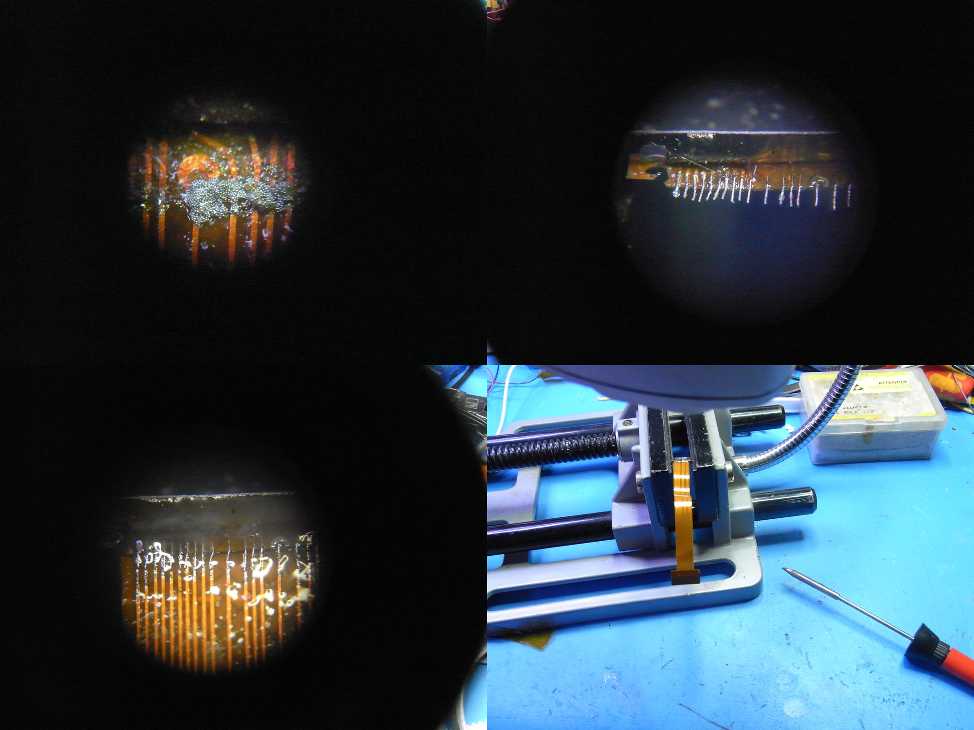 Oben links: Erster Versuch. Beide Teile wurden aneinander gehalten und mit dem Lötkolben im leichten Zickzack an der Risskante verbunden. Einige Verbindungen kamen aber nicht zustande, weil zu wenig Lötzinn da war oder der Abstand zu groß. Mit etwas mehr Lötzinn hatte ich wieder einen Haufen Brücken drin. Auch Lötpaste (unter dem Mikroskop mur ein Haufen Lötperlen) half nicht, da sie zu klebrig ist um fein portioniert und positioniert zu werden.