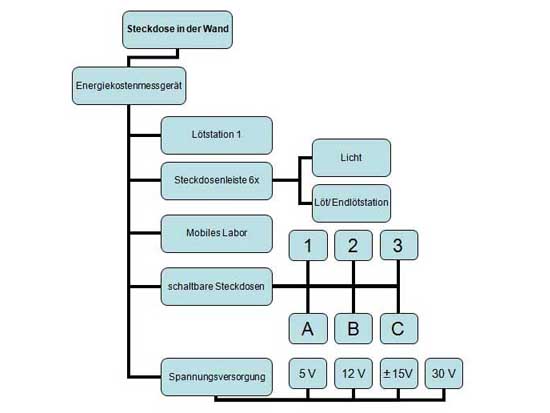 Dabei handelt es sich um die fest installierte Holzkiste in der Mitte. Von dort aus können Spannungen abgegriffen werden. Eine Steckdose ist vorne direkt drin, 6 weitere sind an der Seite der weißen Kiste angebracht und lassen sich alle einzeln schalten. Die blau leuchtende Steckdose in der Mitte ist die Quelle (ein Energiekostenmessgerät).