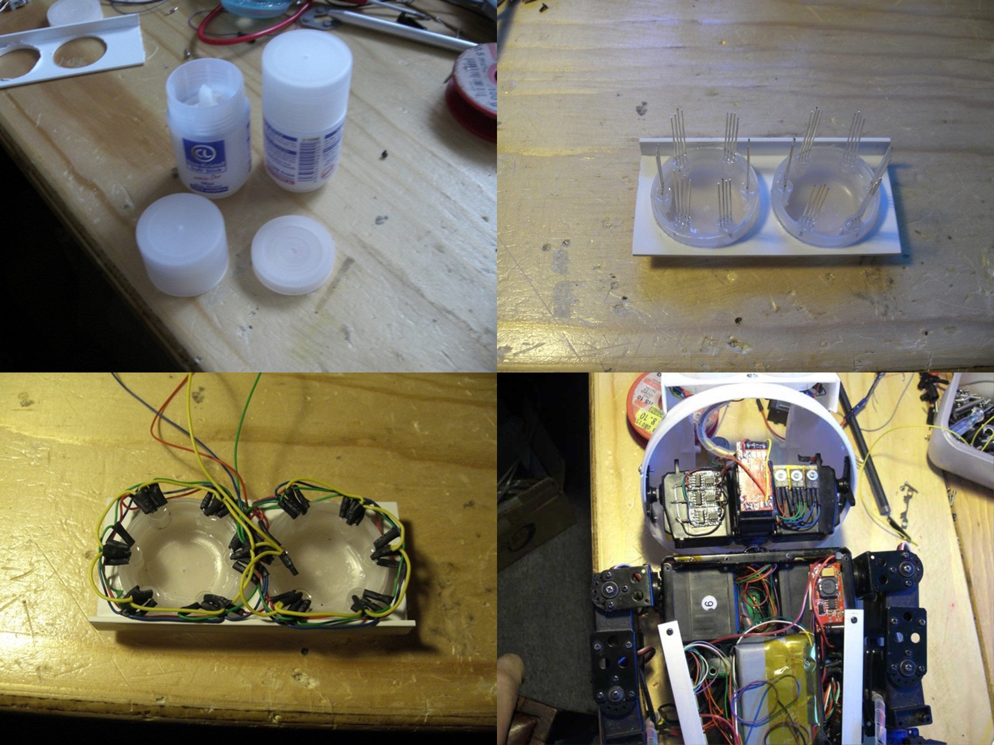 In die Mitte der Augen, sind inzwischen auch Ultraschall Entfernungsmesser eingebaut. Die Steuerplatine ist hinter einem der Servos angebracht. Der Ultraschallsensor, wird auch über RS-232 ausgelesen, allerdings über eine andere Übertragungsgeschwindigkeit (Sensor Baudrate: 9600 Servocontroller: 115200). Er ist noch nicht im Betrieb, dafür muss ich mir erstmal noch was einfallen lassen.