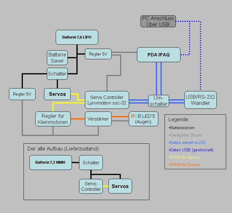 Die Servos wurden stärker und Ausdauer war super, aber ich hab das Batteriepaket nicht eingebaut, weil mir dadurch die Sprachplatine kaputt ging. Während die normalen Batterien auf insgesamt ca. 4,5V kamen, war der erste Versuch bei 5V scheinbar schon zu viel. Die Steuerplatine und die Servos machen das alles mit, die Sprachplatine aber leider nicht. Vorher hat er bei den meisten Posen gesprochen und war in einem gewissen Modus per Sprache steuerbar (ein paar Sätze in Englisch) aber jetzt gibt er keinen Ton von sich und bleibt in jeder Bewegung stehen, in der er normalerweise gesprochen hätte.