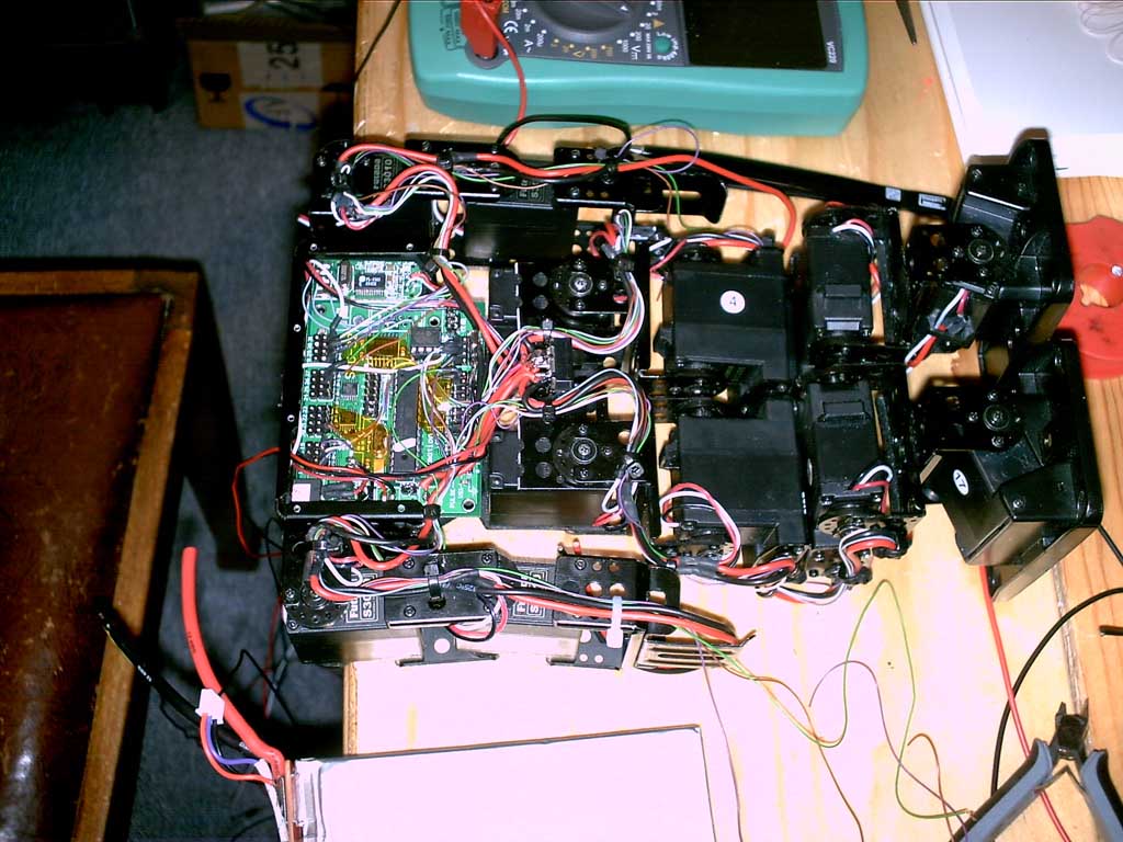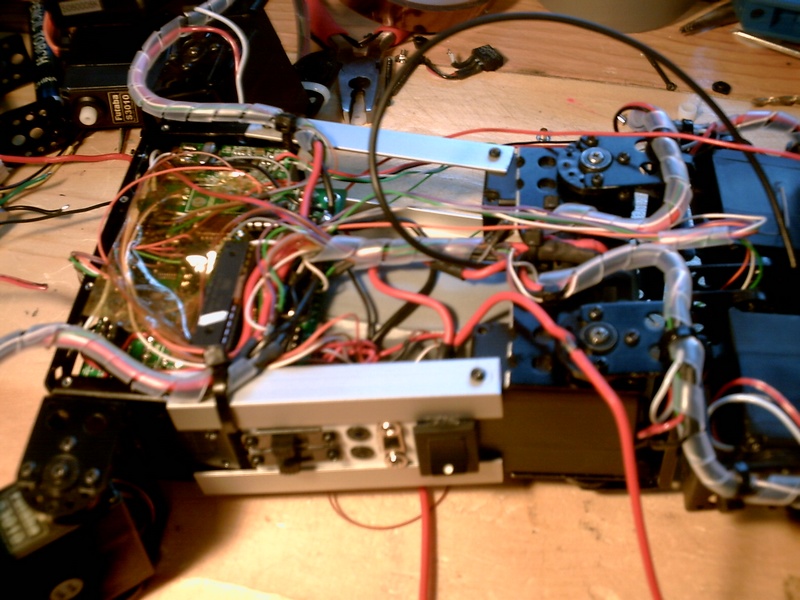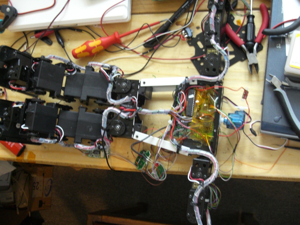Nachdem nun ein defekter Servo gewechselt und der neue Controller eingebaut war, hab ich alle Servos an den Controller verdrahtet, um dem Kabelsalat auf dem Rücken zu entgehen. Außerdem wurde ein USB-RS232 Konverter mit dem Controller verbunden, um die Steuerung vom PC aus zu testen.