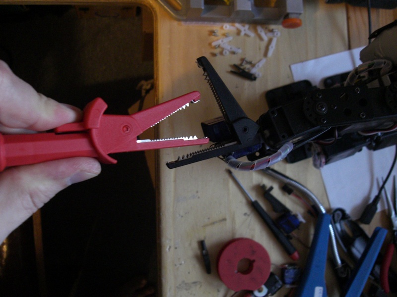 Es wurden ein paar Messzangen (oder auch Krokodilklemmen) genommen und einfach kurz hinter ihrem Gelenkpunkt abgetrennt. Nach ein paar kleineren Änderungen, konnte die Zange in einem Winkel von ca. 80-90° geöffnet werden, während es vorher ca. 40° waren.