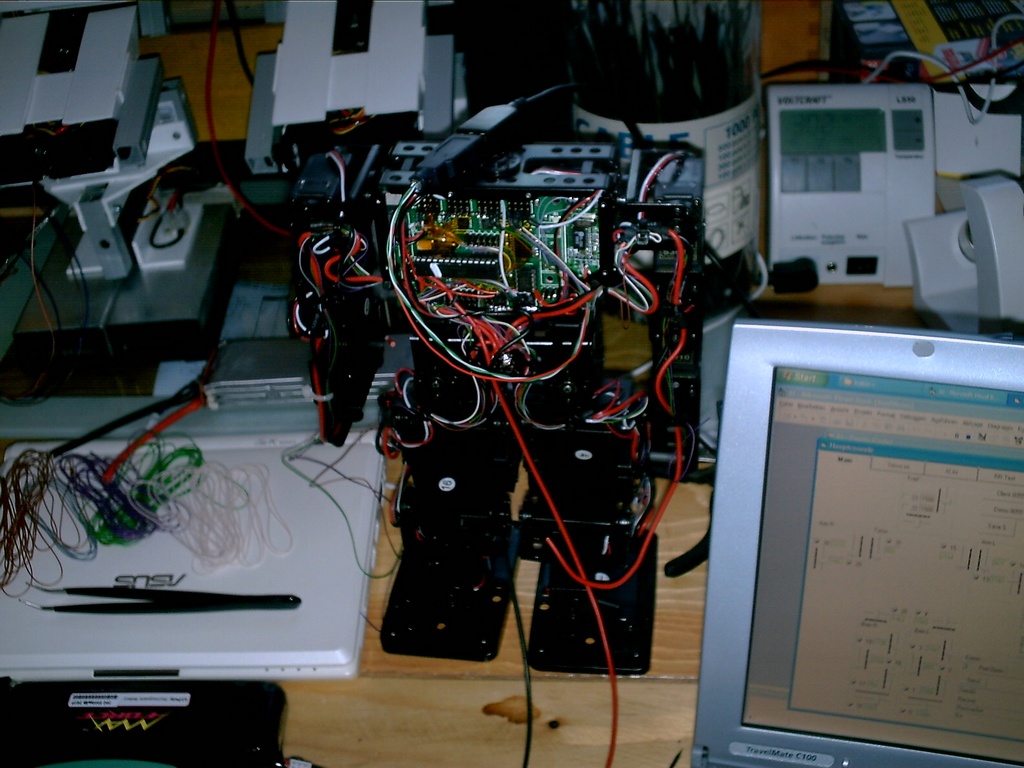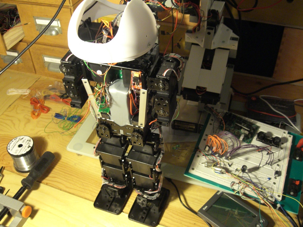 Außerdem ist ein Versuch für den Kopf zu sehen. Dort wurden 2 Miniservos benutzt, um eine horizontale und vertikale Bewegung zuzulassen. Da die kleinen Servos aber nicht genügend Stabilität hatten, wurden sie kurze Zeit später wieder entfernt.
