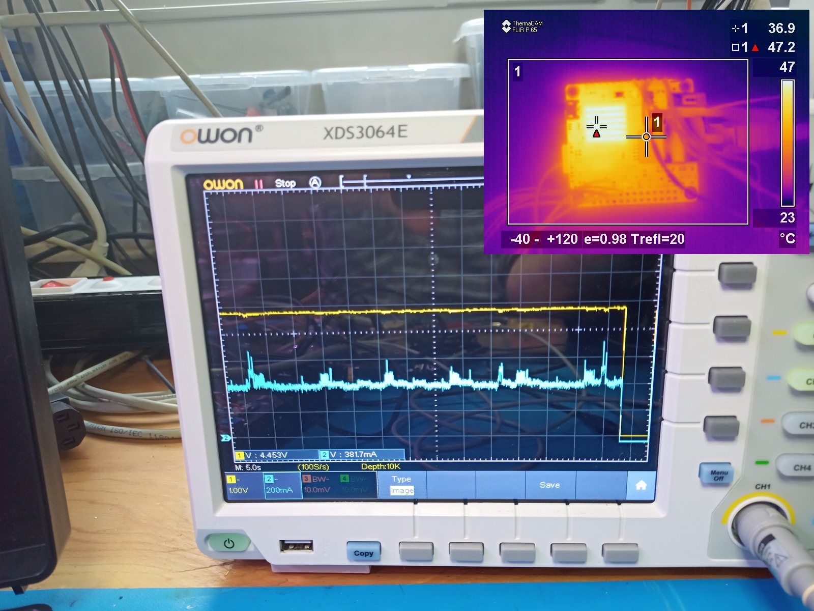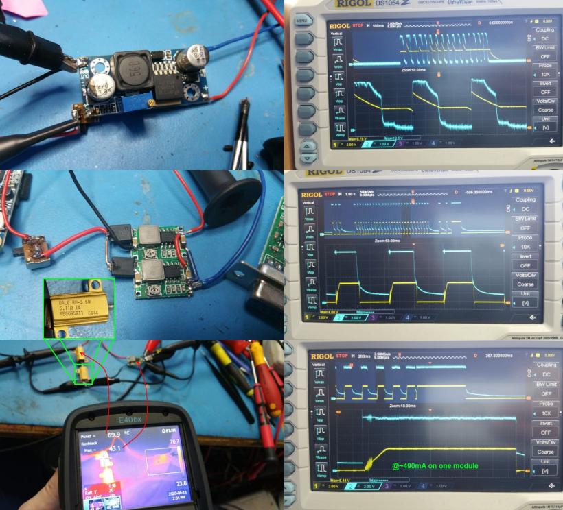 In der Bildreihe unten sieht man ein Belastungstest mit 10.22 Ohm. Der Eingangsstom lag bei rund 490mA und nach ein paar Minuten war das Board nur 43.1°C warm, während die Widerstände fast 70°C hatten.