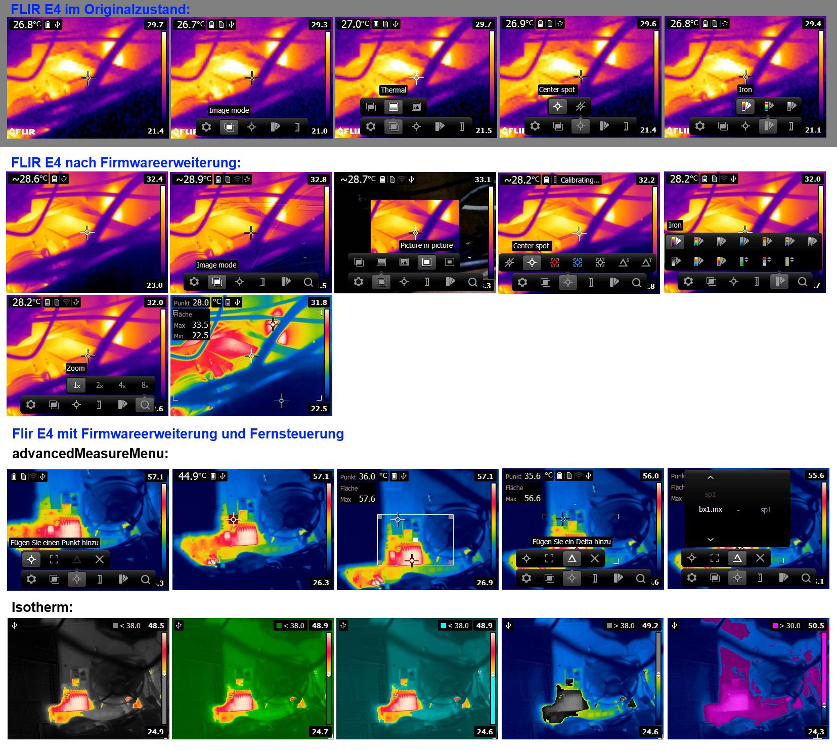 Außerdem können weitere Messungen, ein Digitalzoom (bis x8), weitere Farbpaletten und Picture in Picture Funktionen eingefügt werden.
