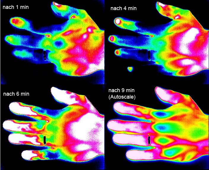 Interessant finde ich, dass sich erst die Fingerspitzen und dann der Rest des Fingers (Richtung Hand) nach erwärmt.