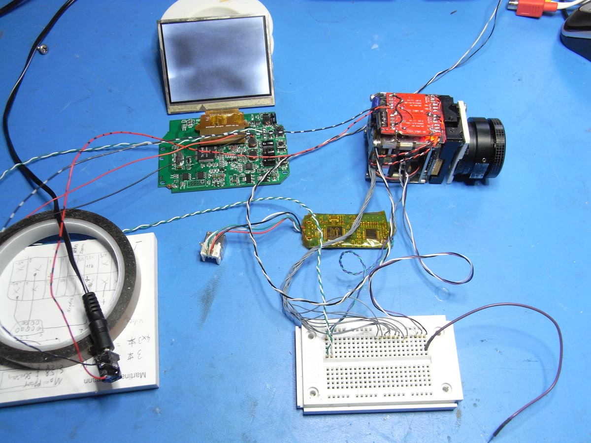 Es stellte sich später heraus, dass die Kamera nur bei einer gewissen Übertragungsgeschwindigkeit auf eine Anfrage "antwortet". Eine Einstellung an der Software geändert und schon konnte ich sie ansteuern. Daher hab ich den Kamerakern freigelegt und alles brauchbare an eine Steckplatine für Versuche verbunden. Die Platine oben links mit dem LCD Bildschirm ist ein Monitor, welcher für Rückfahrkameras am Auto gedacht ist. Dieser Monitor kann ein Analoges Signal direkt anzeigen und sollte früher direkt an die Kamera montiert werden... bis mir die Idee mit dem Camcorder kam.