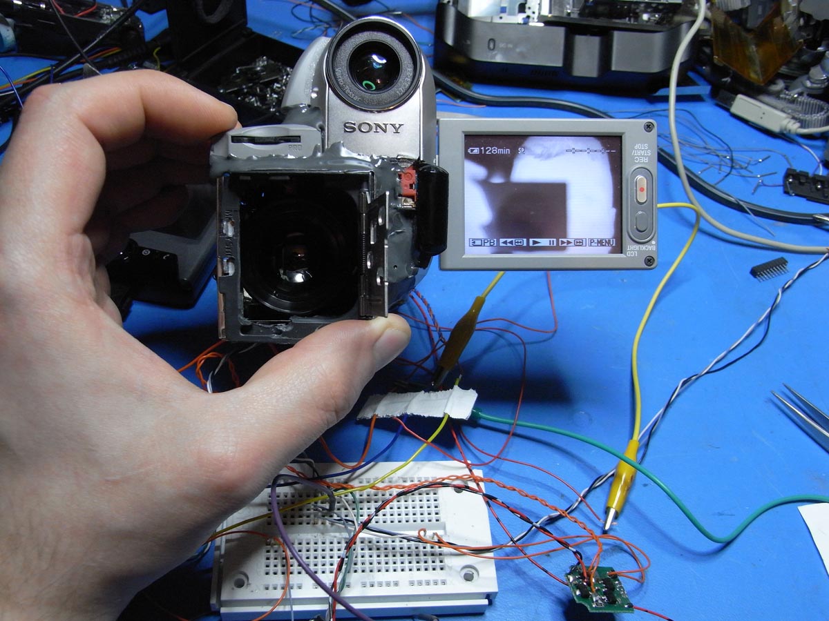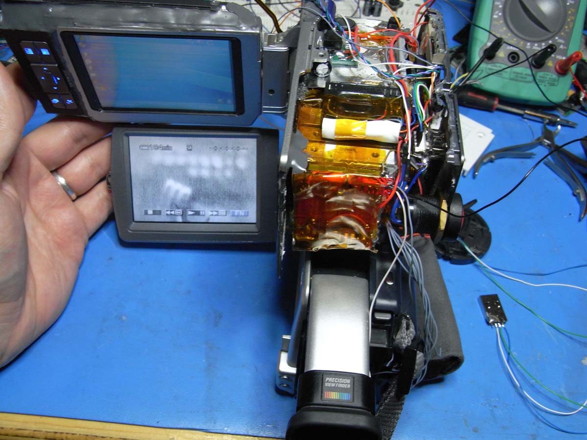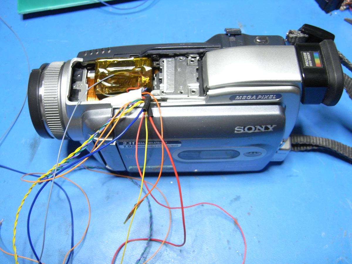 Ich hab durch Messungen am Mainboard die Signale für VCR und Memory abgegriffen. An den Videoanschluss hab ich von innen eine Verbindung hergestellt. Auch das Schaltsignal für Nightshot wurde von innen nach außen geführt.