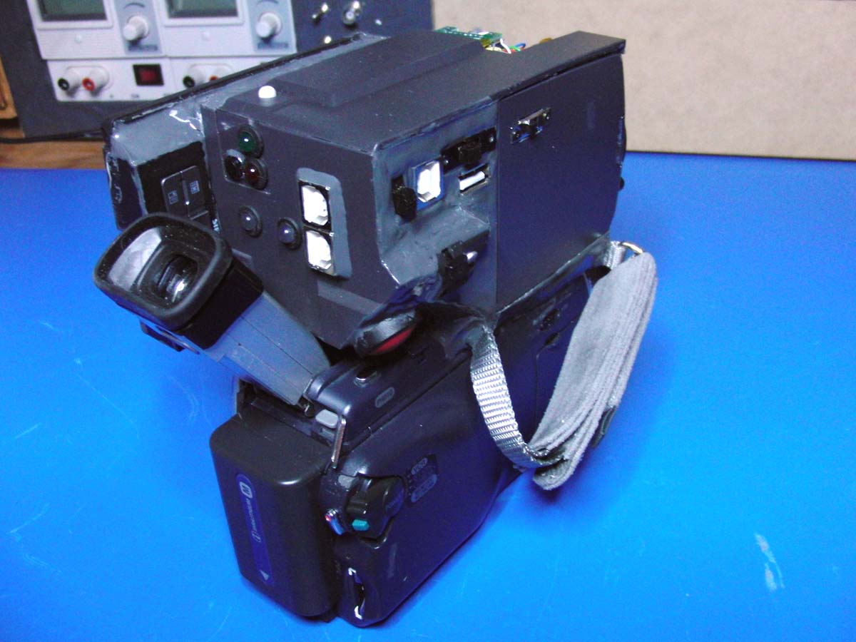 Von einem defekten Camcorder mit 3.5" Display hab ich die Gehäusehälfte mit dem Displayscharnier entfernt. Das wurde dann so lange angepasst, bis ein PDA da rein passte. Der PDA ist zum Steuern vorgesehen und kann (wie das Display vorher) ausgeklappt und gedreht werden.