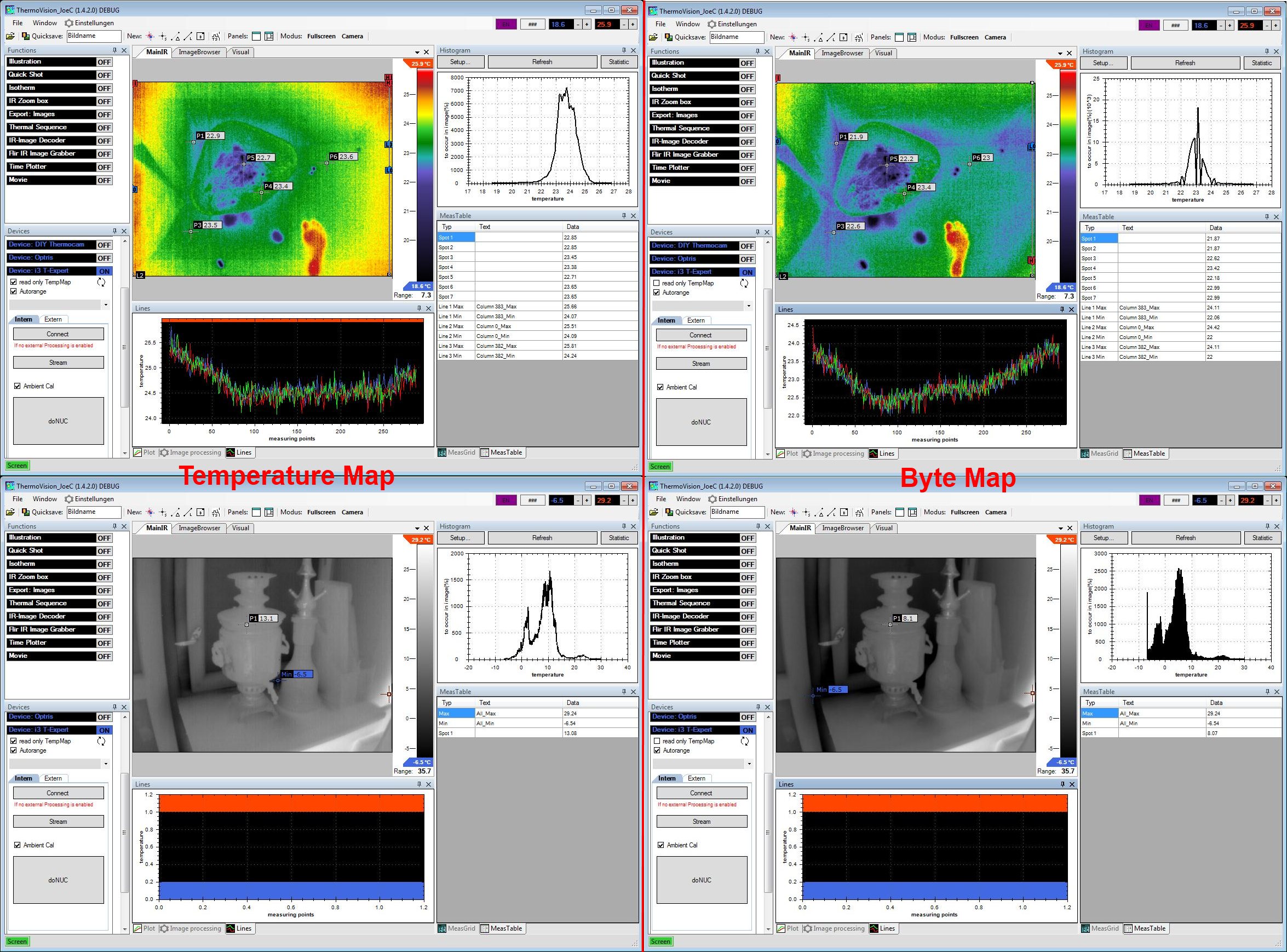 Meine Software unterstützt die Erfassung beider Bilder, also einmal die Temperaturen direkt und einmal die Bytes skaliert auf 0=kleinste Temperatur und 255=höchste Temperatur.