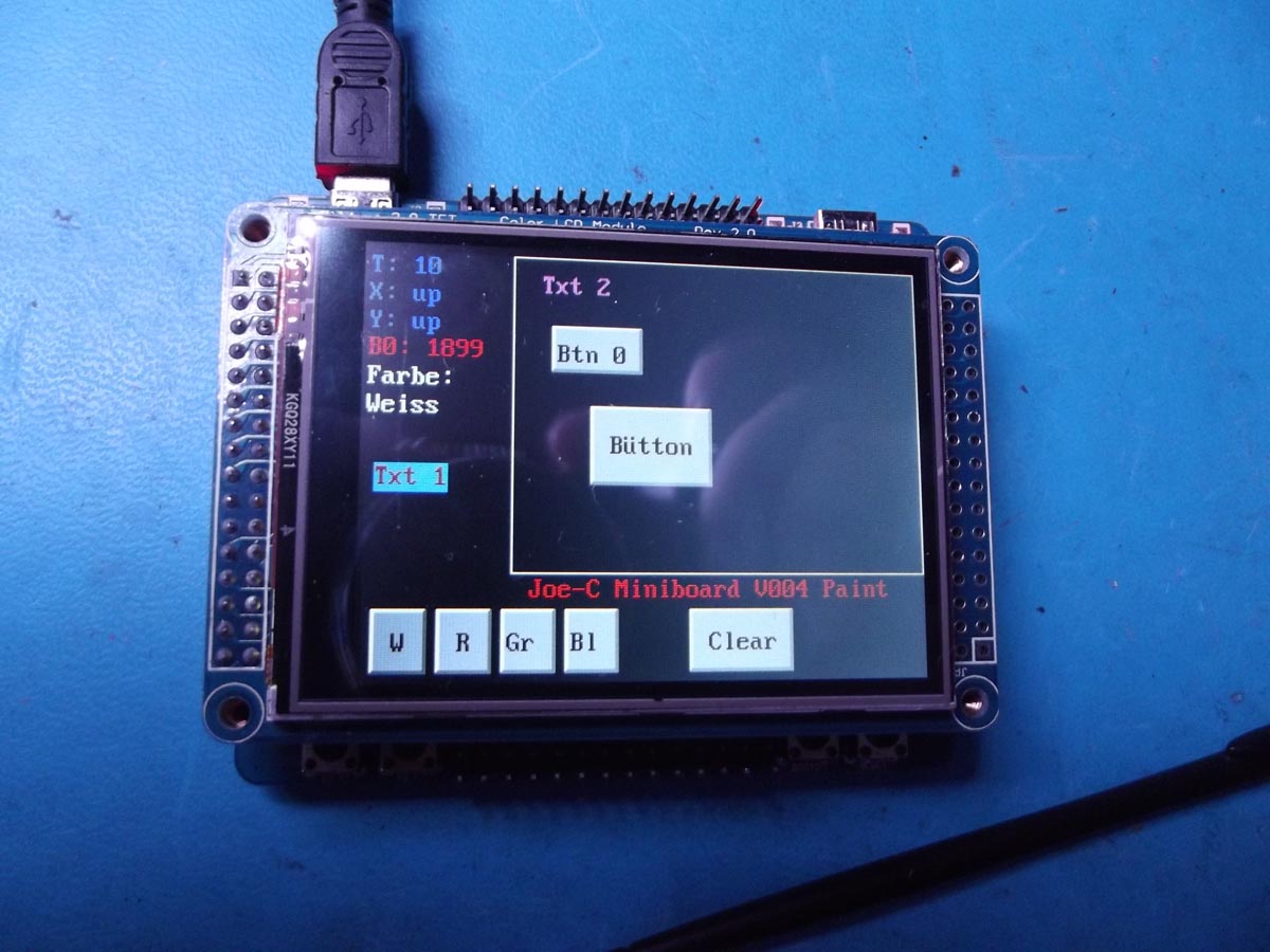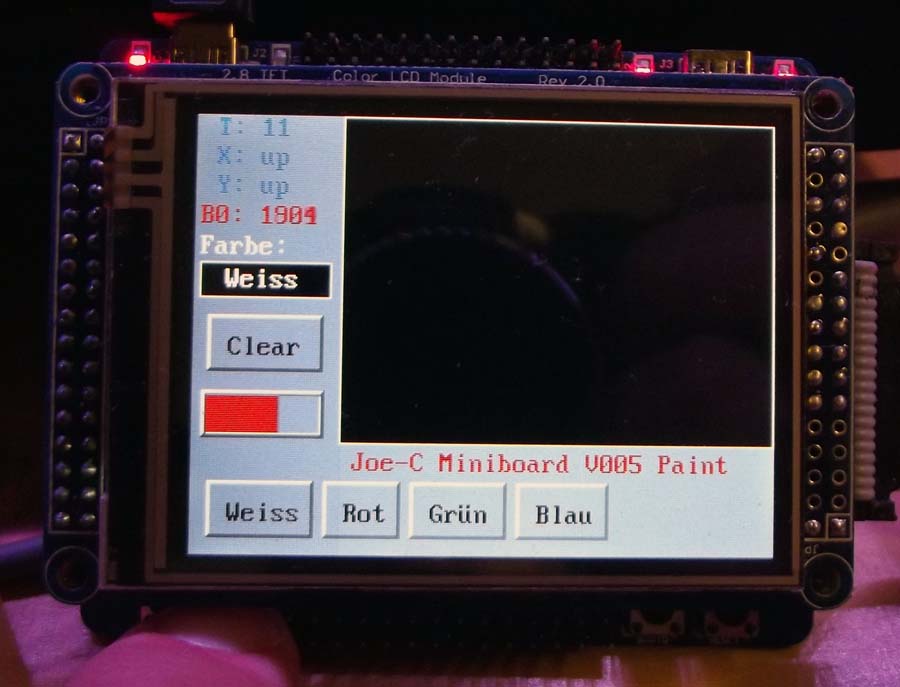 Im Grunde ist es nur eine Mischung aus Touch und LCD Verwendung. Der µC liest die Stiftposition vom Touchscreen und setzt die entsprechenden Pixel auf dem LCD. Mehr ist es im Grunde nicht. Die ausgelesenen Stiftpositionen werden auch in den HID-Array übertragen, so dass bei verbundenem PC auf dem Monitor das schreiben mit verfolgt werden kann (aber nicht in der Performance, wie auf dem Board... das Ganze ist abhängig vom HID-Abfrage-Intervall). Im normalen Modus werden die Stiftpositionen links angezeigt und es werden große Pixel gezeichnet (4 Punkte auf einmal). Im schnellen Modus (wenn Key1 gedrückt gehalten wird) werden nur kleine Pixel (1 Punkt auf einmal) gezeichnet, die Stiftpositionen und die RTC Zähleranzeige werden hingegen nicht aktualisiert... das macht das ganze gekritzel dann relativ flott.