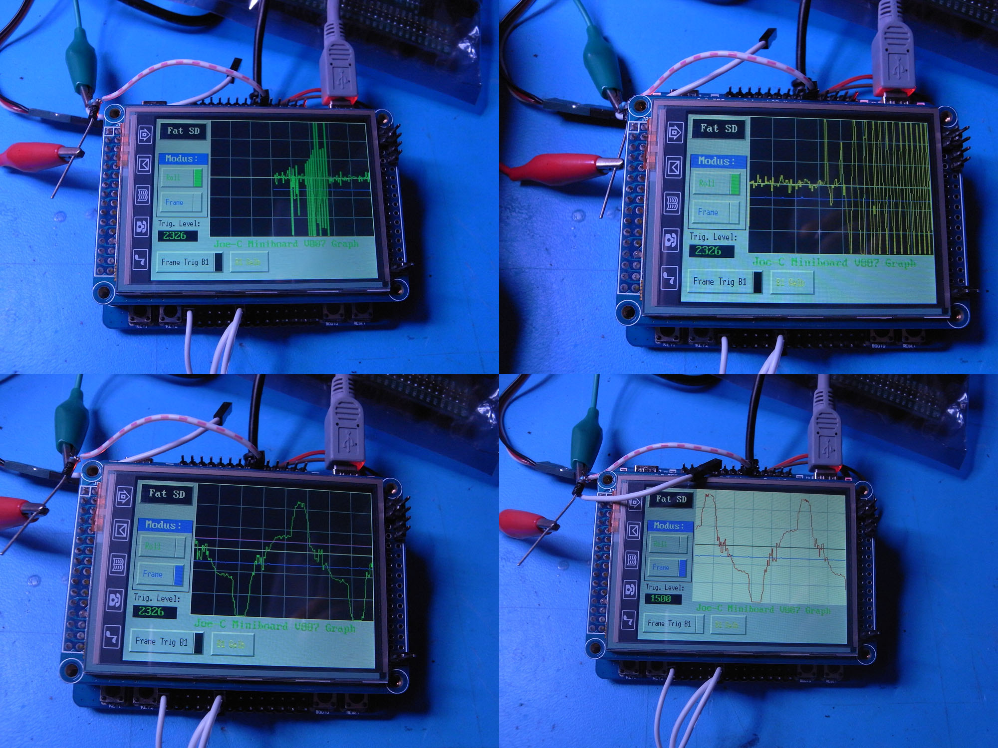 Zuerst wird in einer Schleife ein Buffer mit Messwerten gefüllt, die dann in die Kurven kopiert und dargestellt werden. Die Anzeige wird zwar nicht so oft aktualisiert wie im Roll Mode, aber die Kurve stellt eine sehr viel schnellere Messwertänderung dar. Die Delays sind so eingestellt, dass sie eine 50Hz Schwingung darstellen, wenn man ungeerdet den Pin berührt (und selbst als Antenne funktioniert).