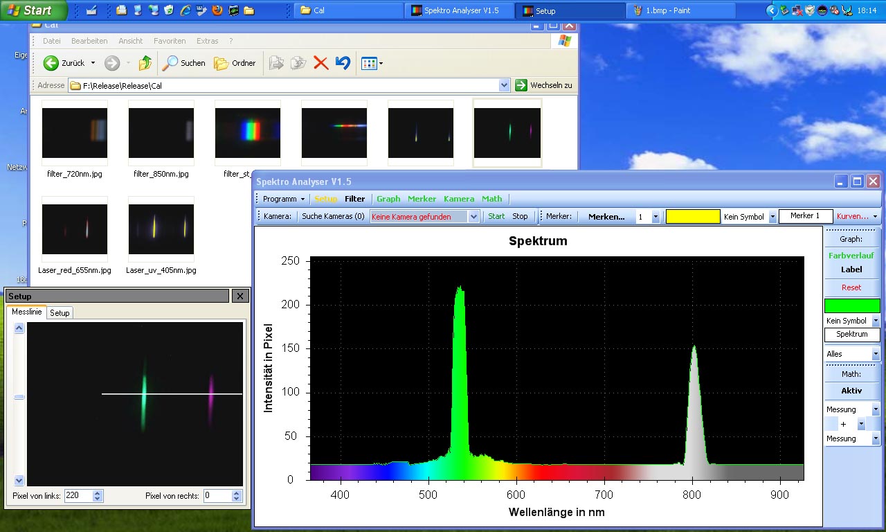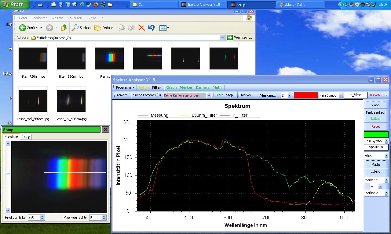 Hier wurden 3 verschiedene Quellen geladen und deren Messwerte über die "Merker" Funktion festgehalten. Die rote Linie zeigt das normale Spektrum einer Webcam (mit IR Filter), die grüne den normalen Spektralbereich vom Tageslicht und die gelbe ein Spektrum mit 850nm Filter.
