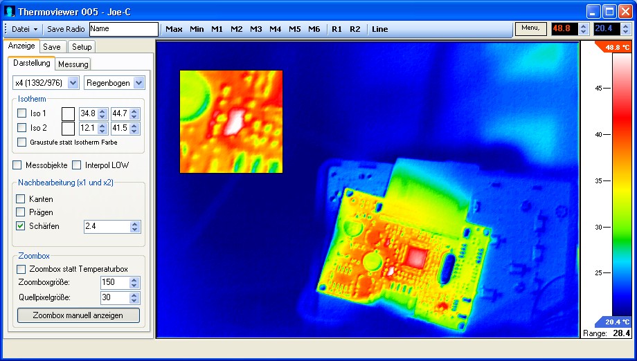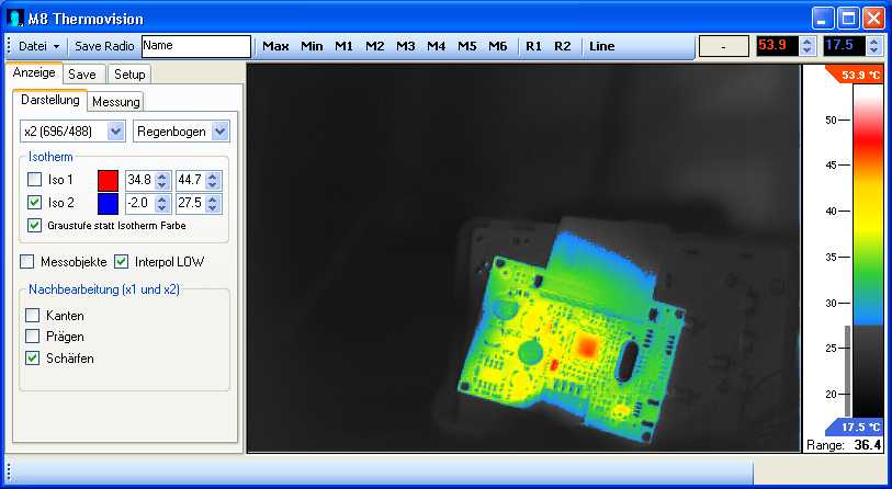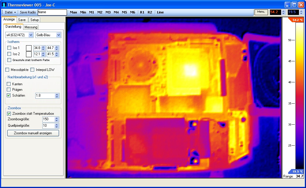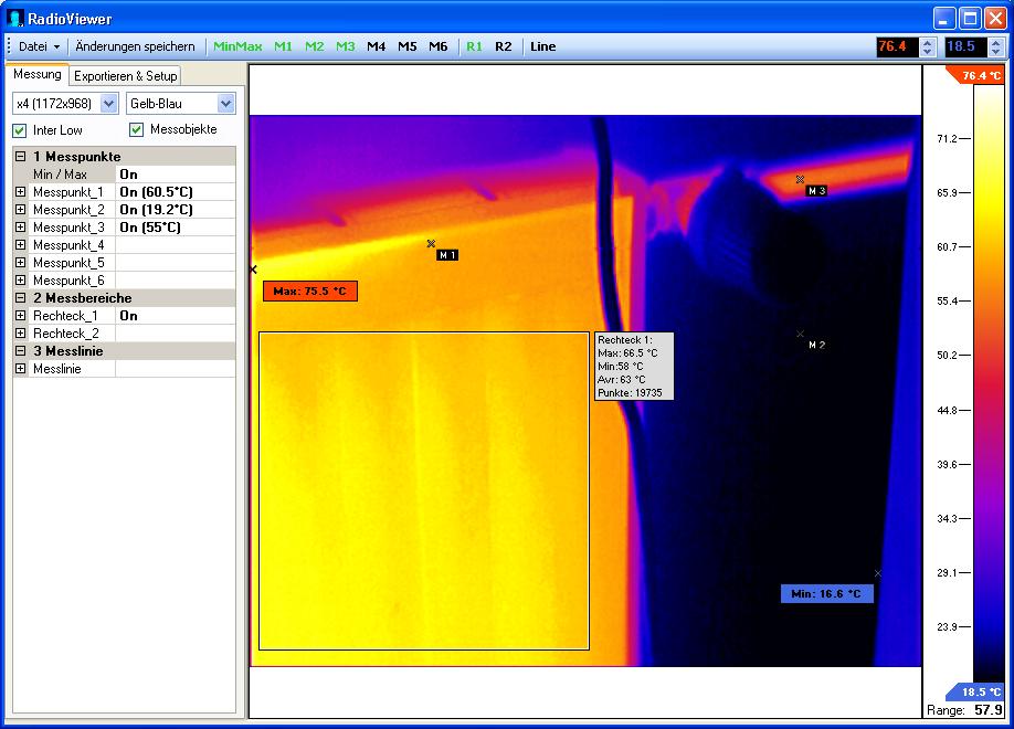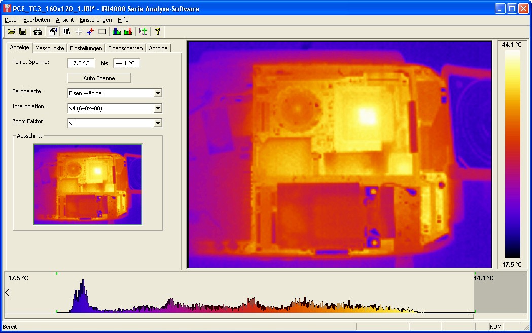 Am Ende der ganzen Prozedur sollte man das aktuelle Kamerawärmebild komplett auf dem PC haben. Dort kann dann das übliche mit Interpolation und Messpunkten angestellt werden.