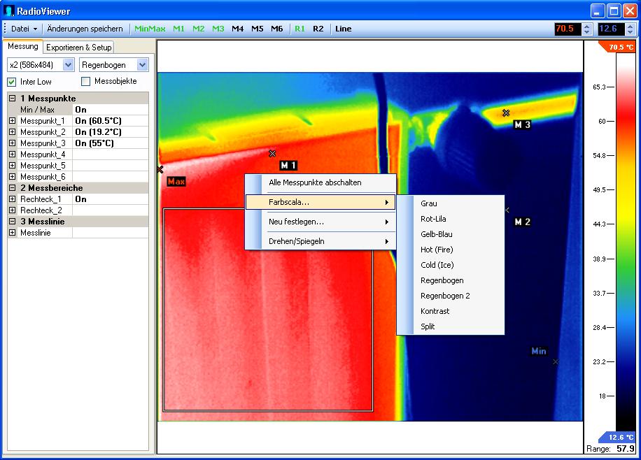 Farbscala ist jetzt Regenbogen, Interpolation auf x2 (586x484) und die Messobjekte sind ausgeblendet (sie werden daher eingezeichnet).