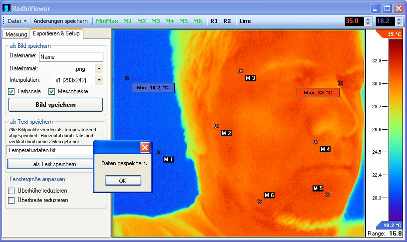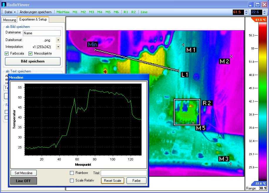 Dank der Interpolation, kann man sich Bilder in unterschiedlichen Auflösungen erstellen lassen. Außerdem kann sich, sofern eingeschaltet, die Temperaturskala und die Messobjekte mit einzeichnen lassen.