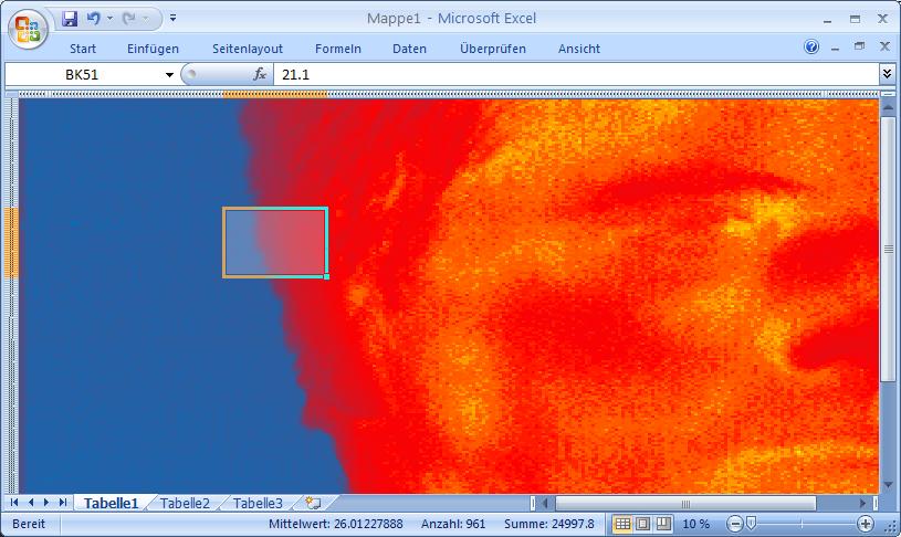 Dafür wurde von jedem Bildpunkt der Temperaturwert erfasst und als Temperaturwert in eine Datei abgespeichert. Jeder Pixel ist dadurch nicht mehr als Bildpunkt, sondern nun als Temperaturwert mit einer Nachkommastelle abgespeichert.