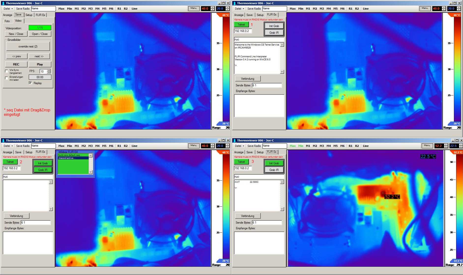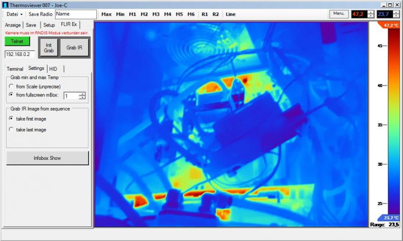 Für die FLIR Ex hab ich ein eigenes Programm entwickelt. Der Thermoviewer wurde erst nur verwendet, um die Sequenzdatein etwas genauer zu begutachten. Die Kamera muss mit Telnet verbindbar sein (über USB mit RNDIS, RNDIS_UVC oder RNDIS_MSD verbunden und IP im Thermoviewer eingestellt).