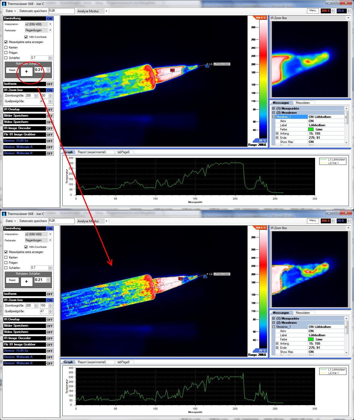 Die Minimal und Maximalwerte des gesamten Bildes werden nicht verändert. Aber die Pixel dazwischen verschieben sich an den Kanten, was letztendlich die Messwerte verfälscht, aber die Bildqualität Signifikat verbessert. Beim Laden des Bildes werden die Rohdaten im Hintergrund ein zweites Mal im Arbeitsspeicher abgelegt (nur 1.5KB extra, bei 320x240 Bild), daher kann man Rohdaten auch wieder mit "Reset" zurücksetzen.