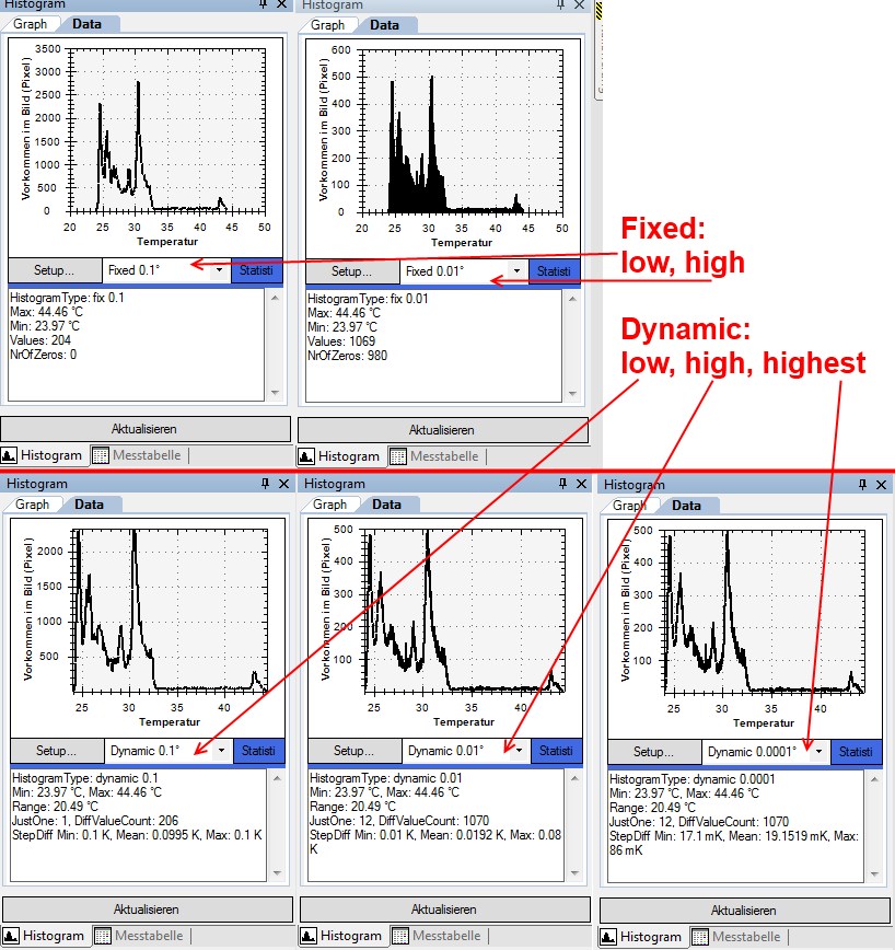 Dynamic, rundet jede Pixeltemperatur zur eingestellten Schrittweite und zählt oder Erweitert mit jedem Pixel die Liste. Die erzeugte Liste besteht nur aus vorhandenen Temperaturen, die können aber unterschiedlich weit voneinander entfernt sein, wenn die Temperaturen sortiert in der Liste stehen.