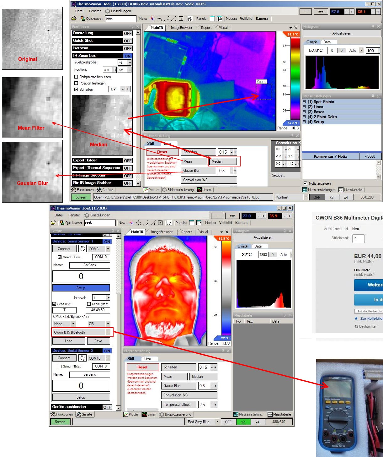Außerdem wird jetzt das Protokoll für das Multimeter OWON B35 unterstützt. Damit ist es möglich, neben den regulären Wärmebildtemperaturen auch Spannungen, Ströme, Widerstände oder andere Parameter aufzunehmen.