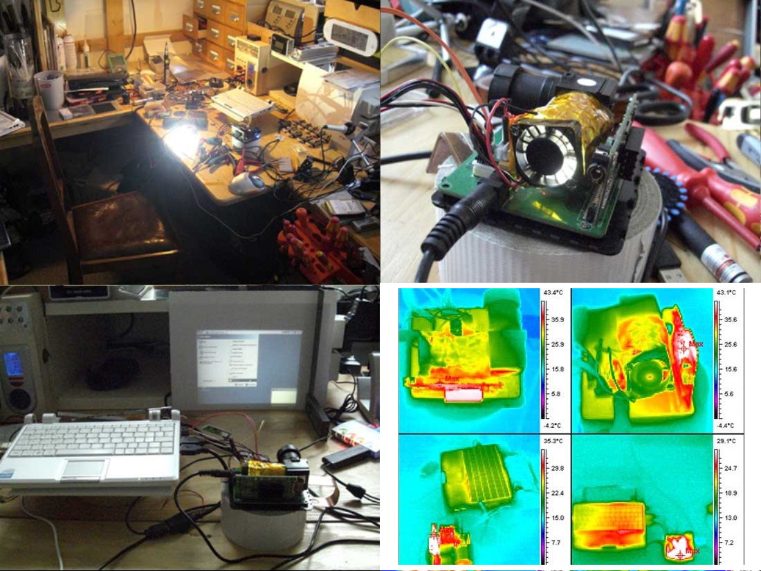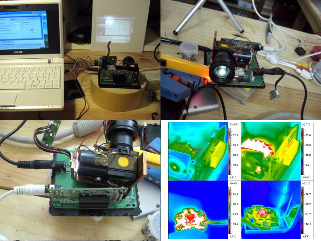 Hier ist eine Wärmebildaufnahme vom alten Aufbau. Die beiden oberen zeigen den alten Zustand im Normalfall und wenn der Lüfter für ca. 1min angehalten wird. Unten die Hi-Power-LED nach 10 sec ohne Kühlung und ca. 30 sec mit. Die Hi-Power-LED (3W) hat übrigens genügend Power, um mit meiner Energiesparlame mit zu halten die mein Zimmer beleuchtet (10W). Zumindest habe ich es so empfunden.
