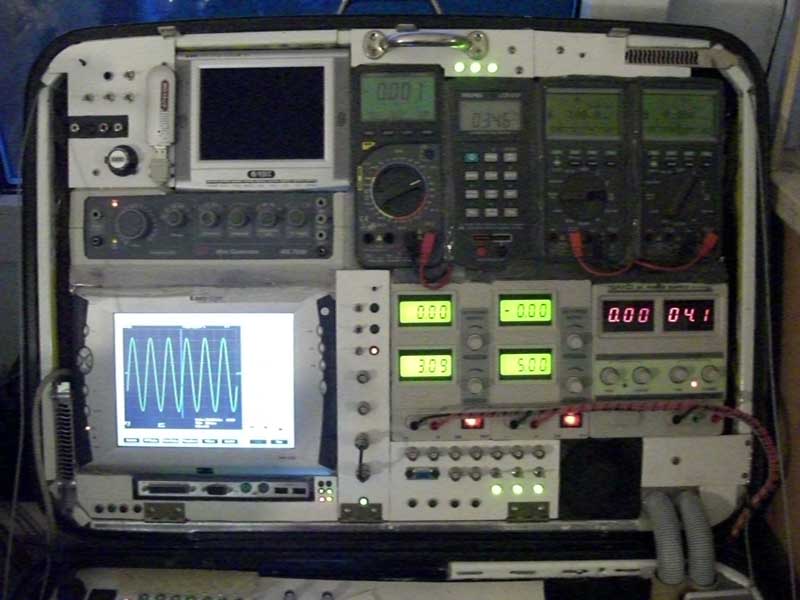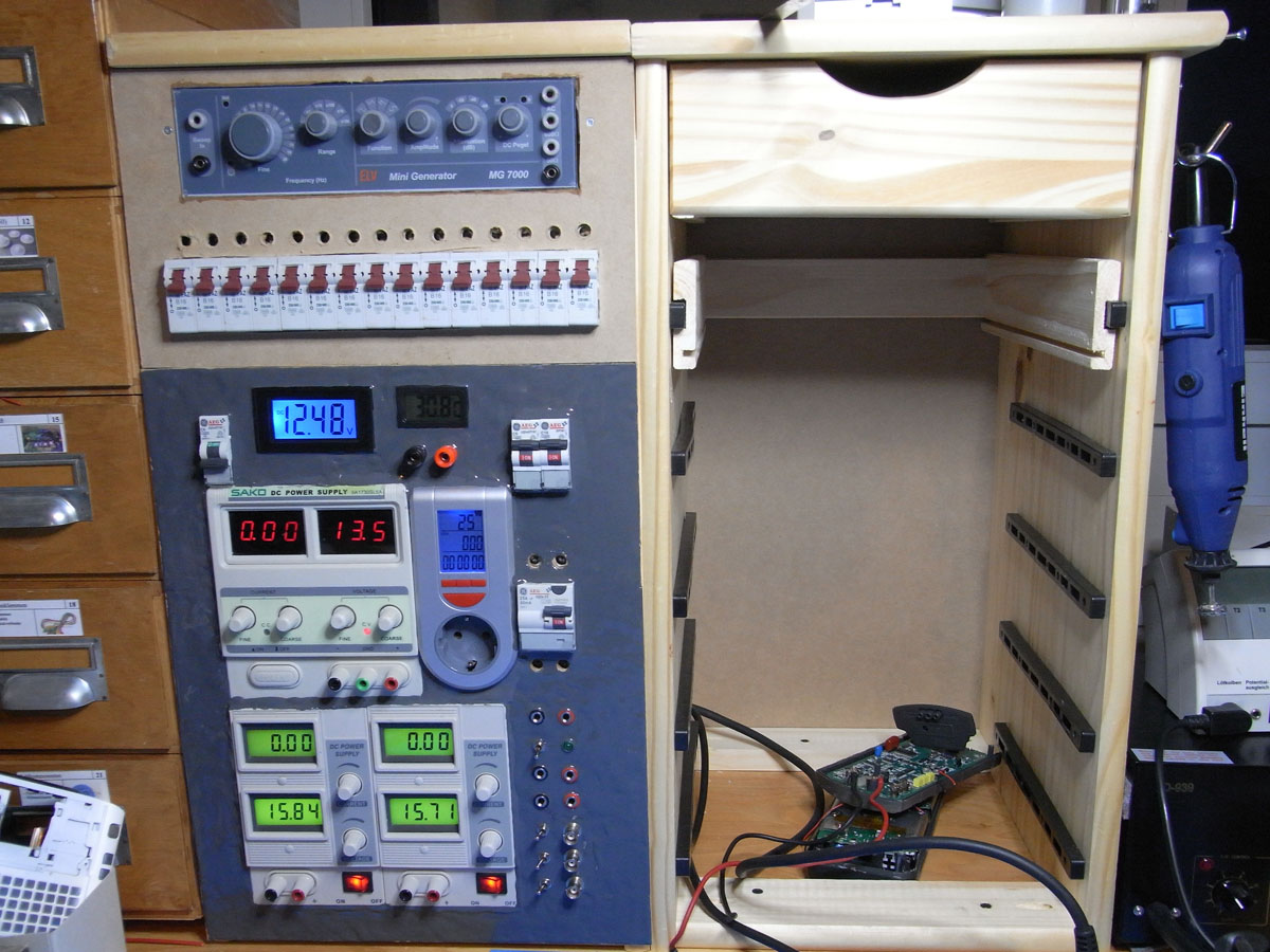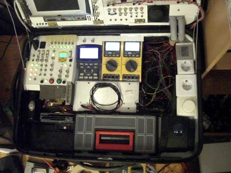 Damals kam mir die Idee, Netzteile und Messgeräte in einem großen Reisekoffer unter zu bringen. Dann konnte ich das Teil einfach zuklappen und verstauen, ohne viel Platz dafür opfern zu müssen.