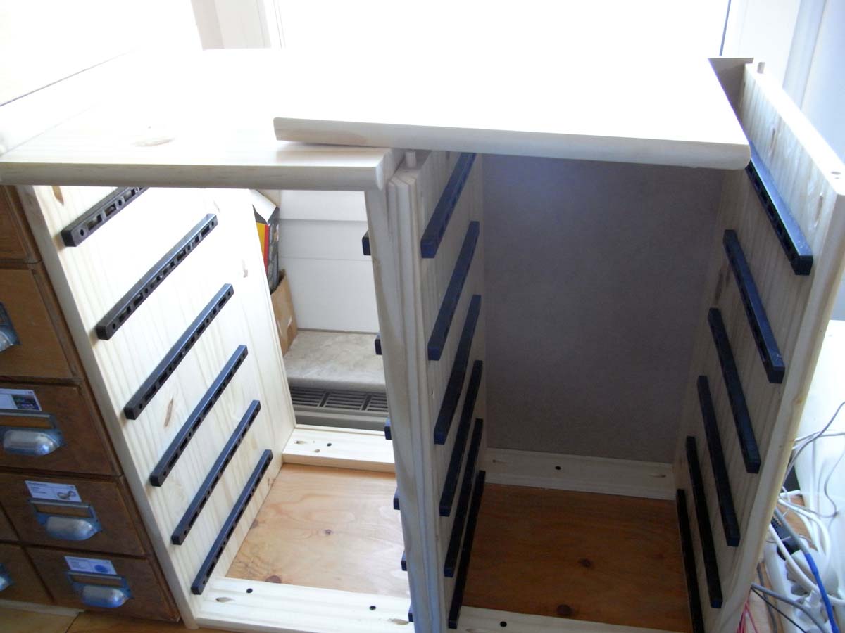 Für diesen Zweck habe ich bei Aldi 2 Rollschränke aus Holz erworben. Die Rollen bleiben weg und die Einlegeböden, werden teilweise als Frontplatte eingesetzt. Diese 3mm Platten bestehen aus gepresster Pappe und sind um einiges stabiler als das Sperrholz, was bei mir noch rumliegt (und teilweise als Frontplatte eingesetzt wurde). Außerdem sind die sehr eben in ihrer Beschaffenheit (optisch und mechanisch) und lassen sich relativ leicht bearbeiten.