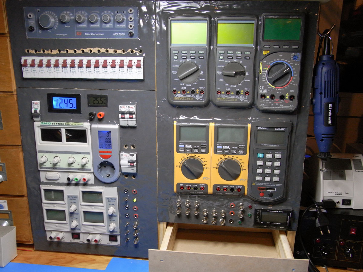 Jetzt hat jedes Messgerät ein eigenes Netzteil. Diese sind teilweise etwas überdimensioniert. Aber den Platz hab ich ja und so entsteht eben etwas weniger Wärme, was ja auch nicht verkehrt ist. Ich habe alle Messgeräte im eingeschalteten Zustand gegeneinander gemessen und weiß nun, dass sie sich nicht gegenseitig kurzschließen werden.