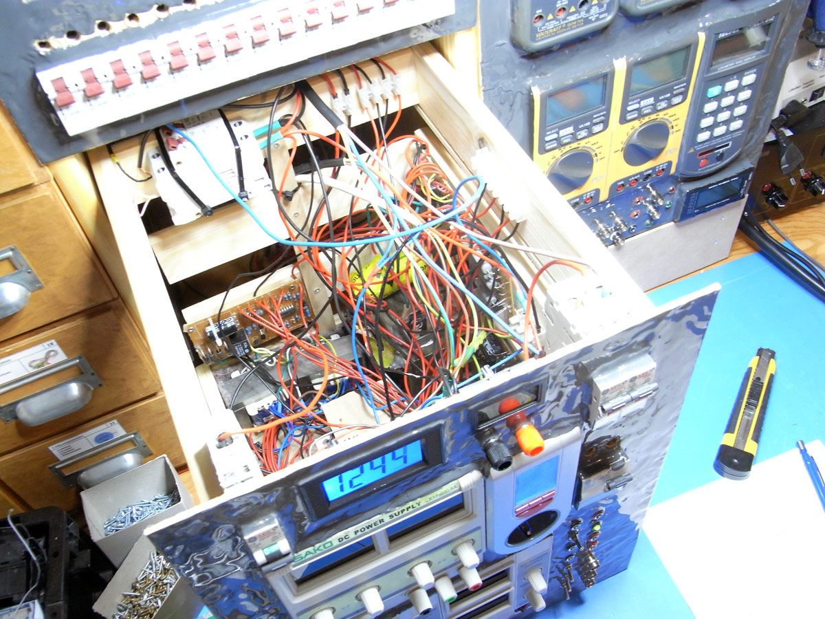 In der unteren Hälfte, sind vorwiegend Schalter, Anschlüsse und Netzteile untergebracht. Dass sich dort noch etwas mehr tun muss, ist denke ich nicht schwer zu erkennen.