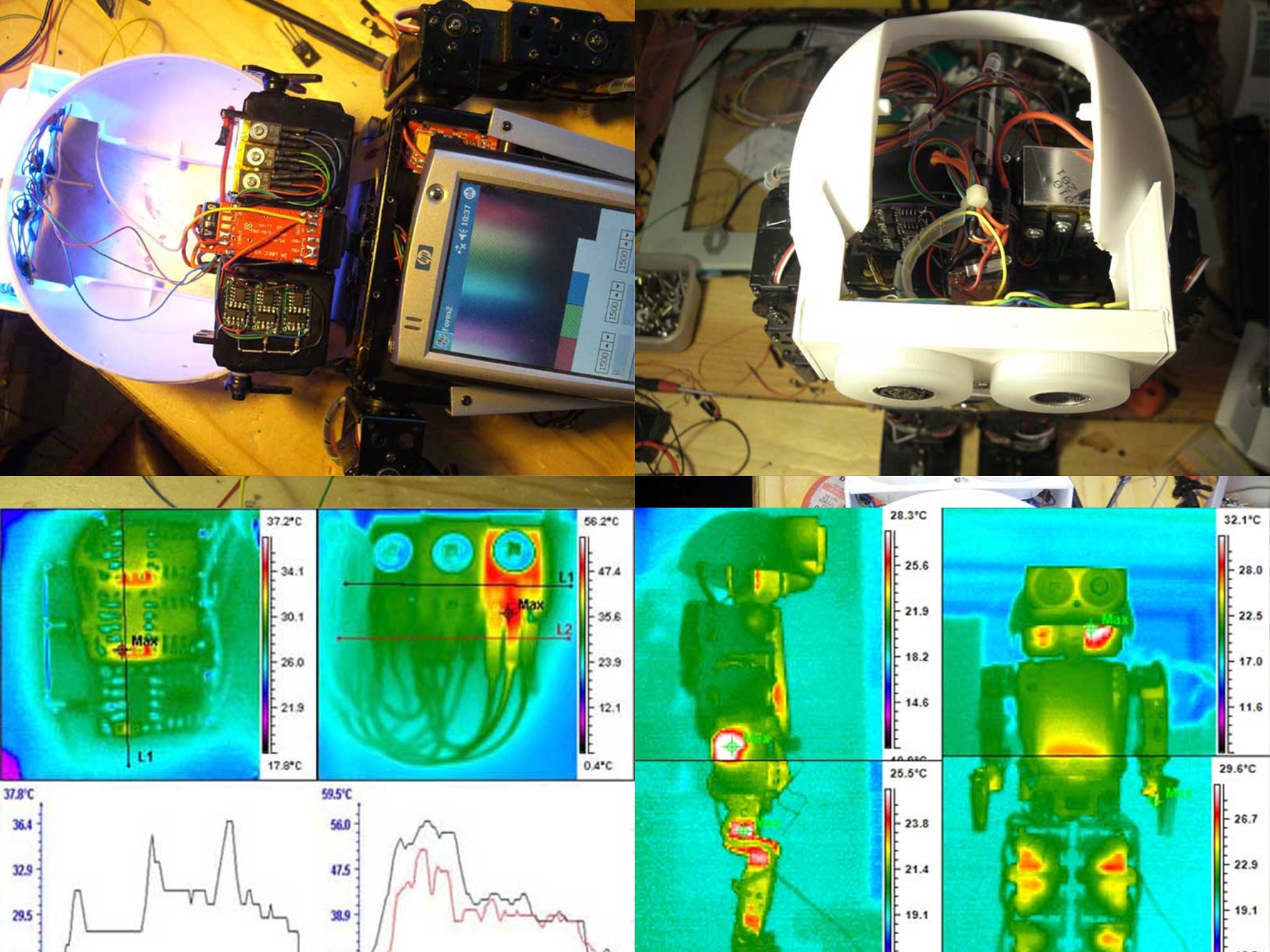 Außerdem ist ein Versuch für den Kopf zu sehen. Dort wurden 2 Miniservos benutzt, um eine horizontale und vertikale Bewegung zuzulassen. Da die kleinen Servos aber nicht genügend Stabilität hatten, wurden sie kurze Zeit später wieder entfernt.