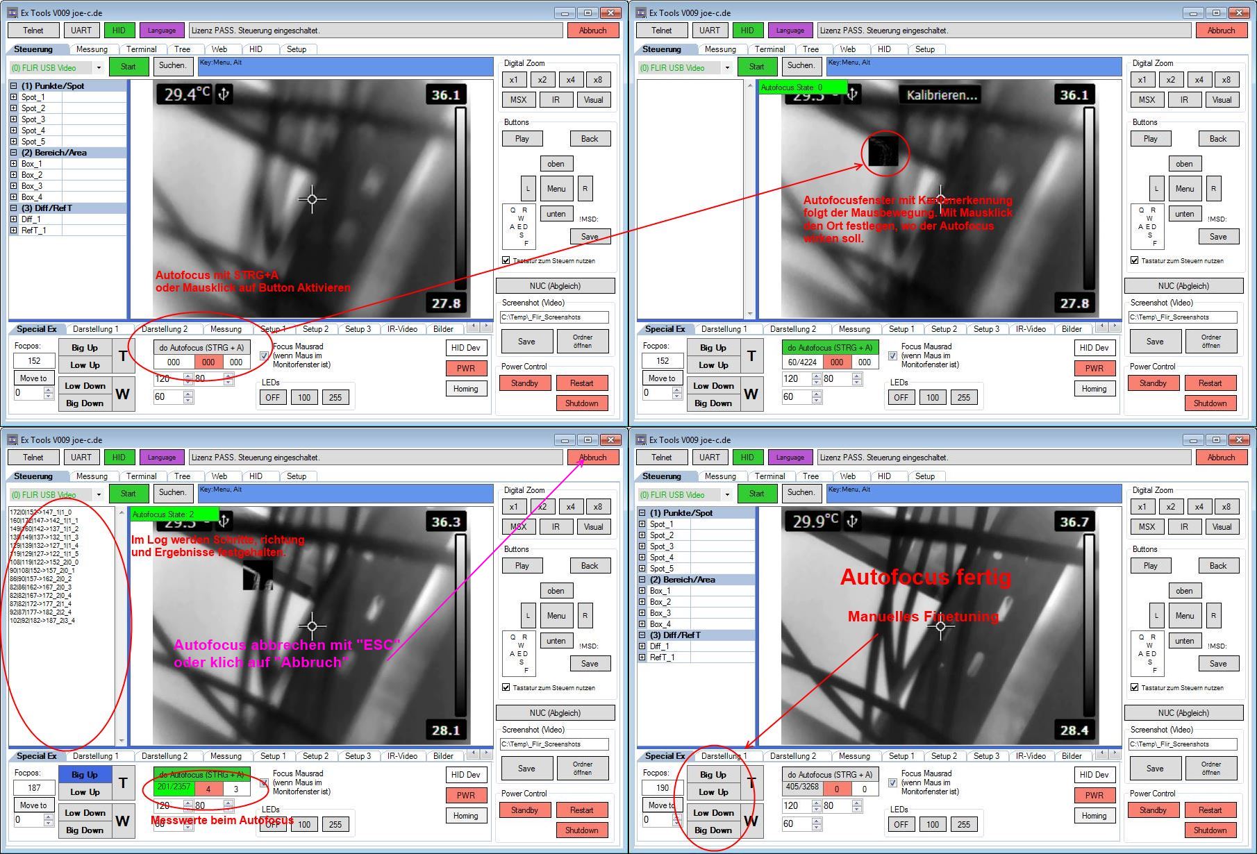 - Ex-Tools (english Description here: Ex-Tools EN), ist ein Fernsteuerungsprogramm, welches das Videobild der Kamera auf dem PC zeigt und vielfältige Steuerungsmöglichkeiten zulässt...Einstellungen verstellen, Funkionen ein/ausschalten, Messungen auslesen, Bilder Downloaden, Videos aufzeichnen und vieles mehr... Dieses Programm kann man hier als Demo downloaden. Es wird es in absehbarer Zeit zu kaufen sein, dafür ist aber noch einiges zu klären...