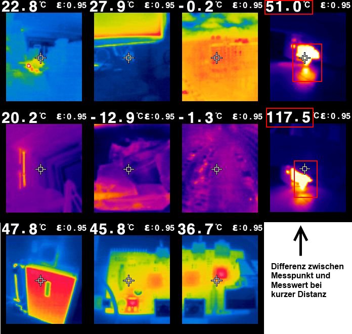 Die Kamera hat, aufgrund ihres Aufbaus und der Tatsache, das die Temperaturdaten nur von dem Pyrometerteil kommen den Effekt, bei nahen Objekten das Messkreuz am falschen Punkt zu haben.