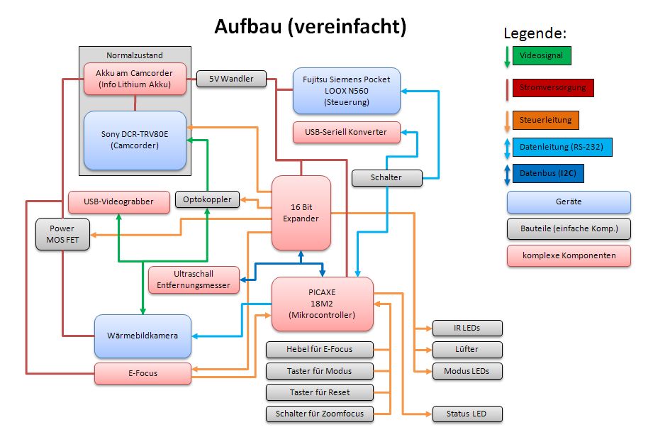Die Hauptsteuerung erfolgt über einen Mikrocontroller mit 16 Bit I/O Erweiterung. Dieser wird über die serielle Schnittstelle (vom PDA oder PC) mit Befehlen versorgt und steuert Camcorder und die Wärmebildkamera.