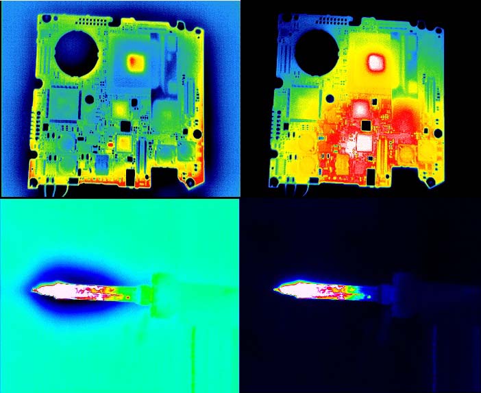 Mainboard eines Sony UX nach 5 min Betrieb und das gleiche Mainboard 10 Sec. später, mit abgeschalteten ENH Filter. Wie massiv die Auswirkungen des Filters sind, erkennt man besonders gut im unteren Zentrum der Platine.